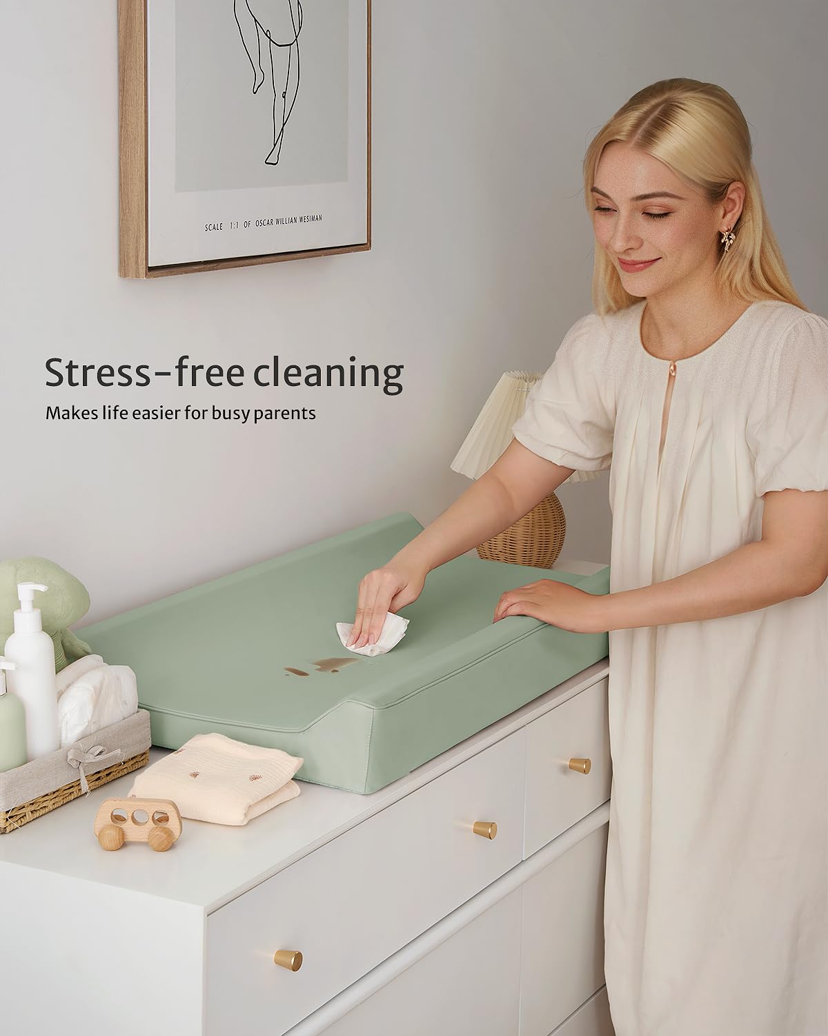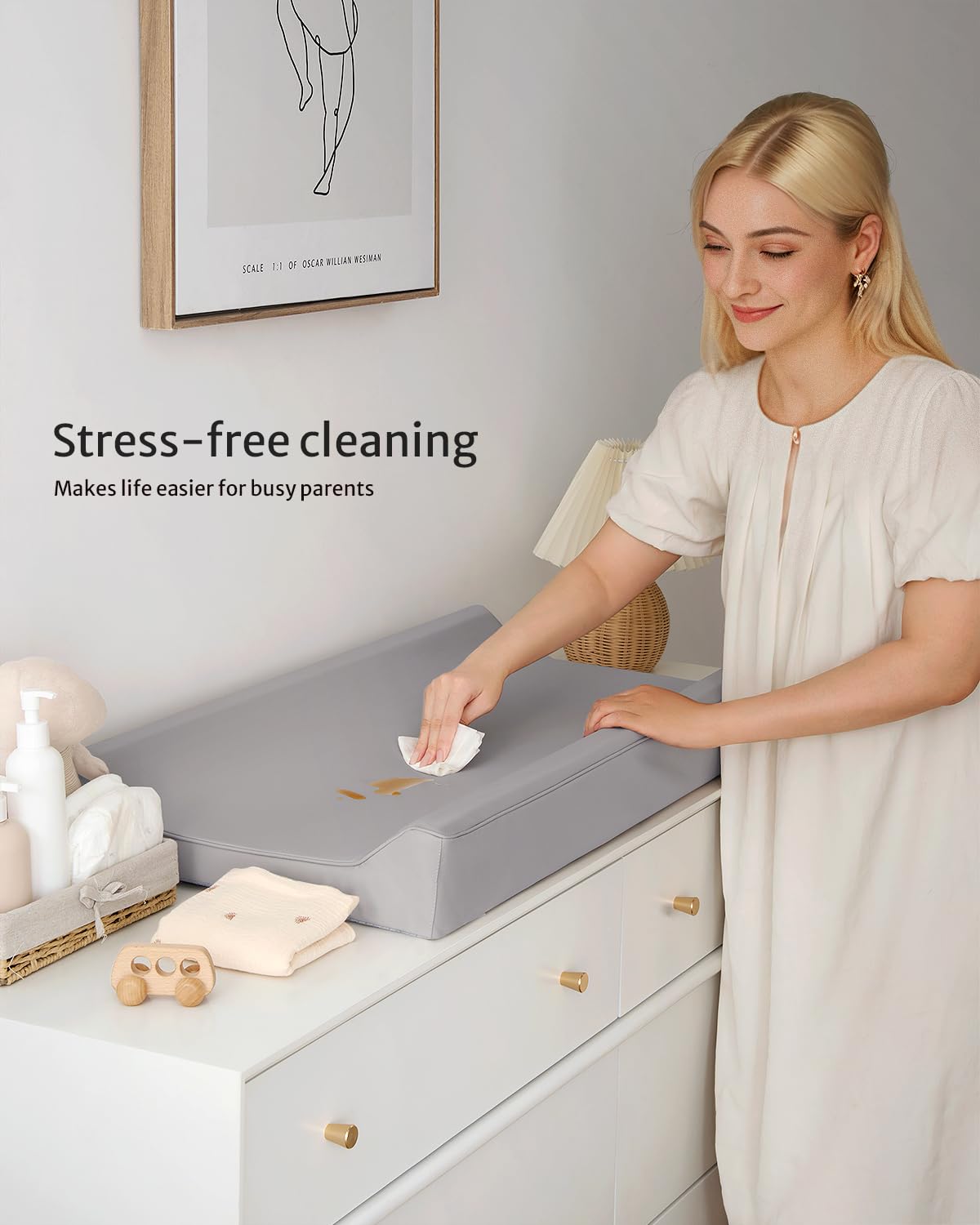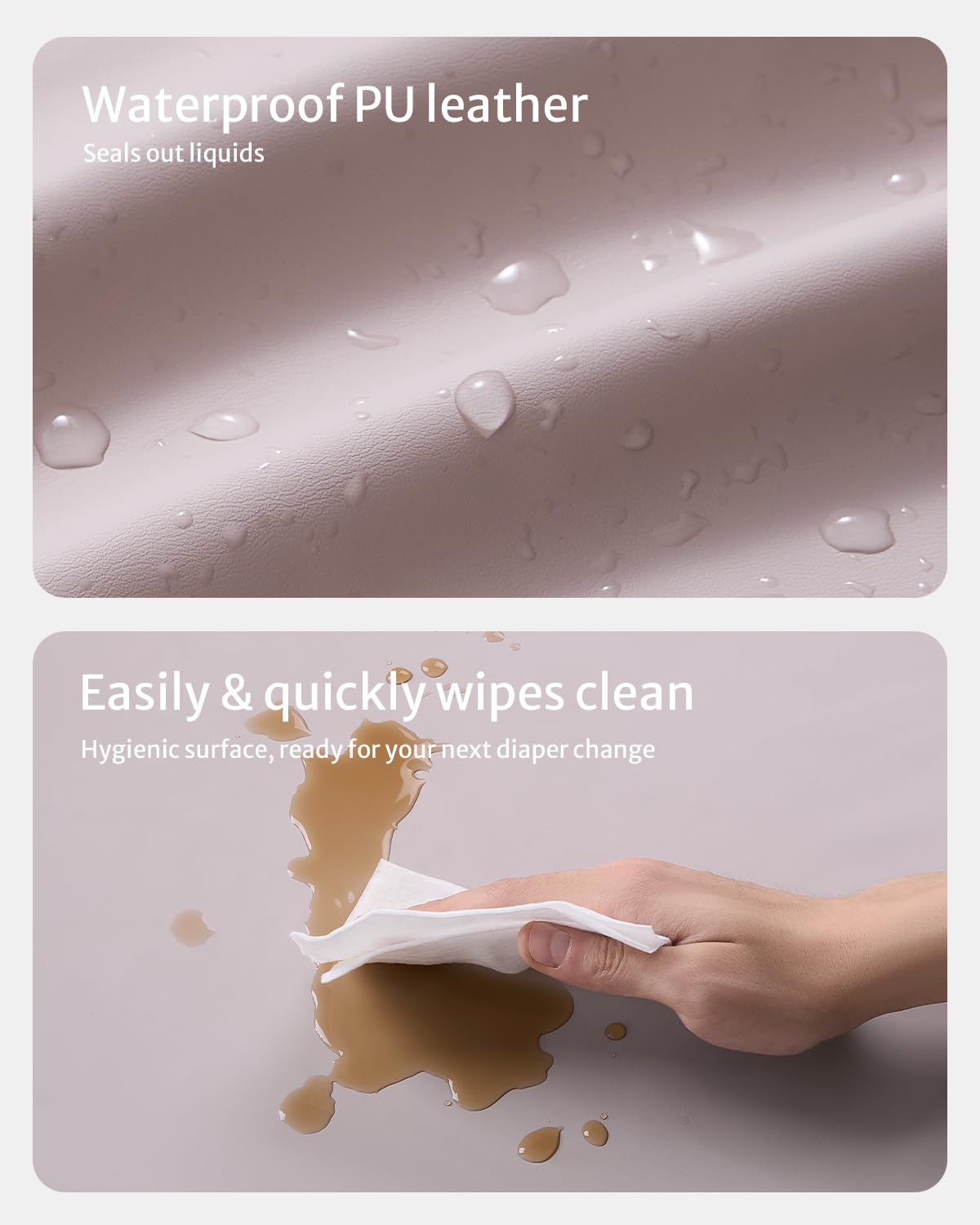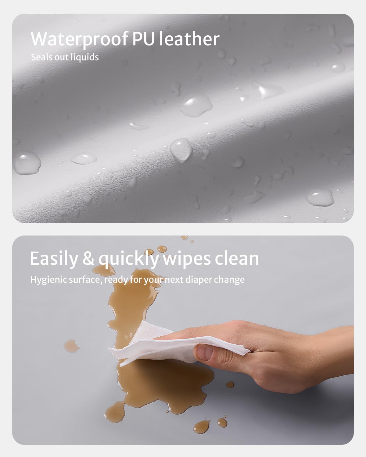 - Waterproof & Wipe-clean - Unavoidable mess and frequent laundry? Oh, no worries! Our contoured changing pad features a waterproof PU surface that wipes clean in seconds, ensuring a fresh and hygienic surface for your next diaper change. Fewer cover changes and less laundry make parenting easier