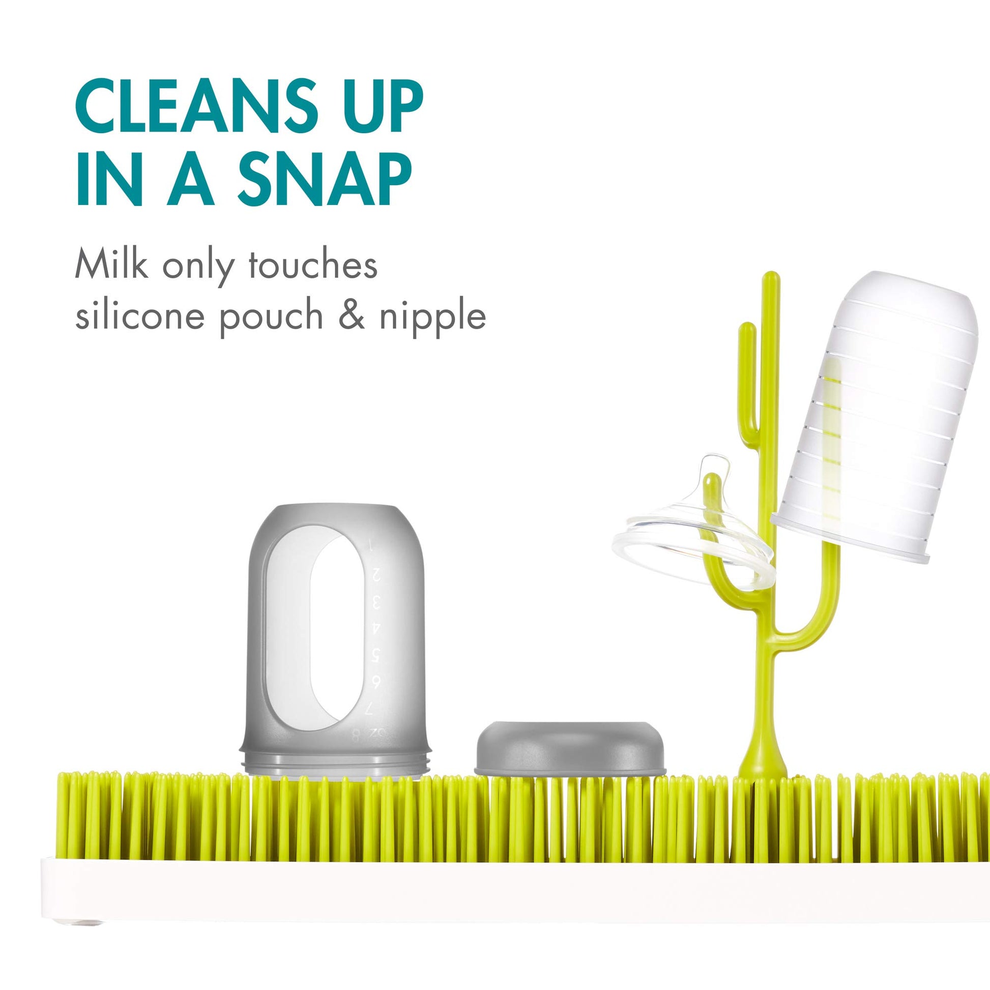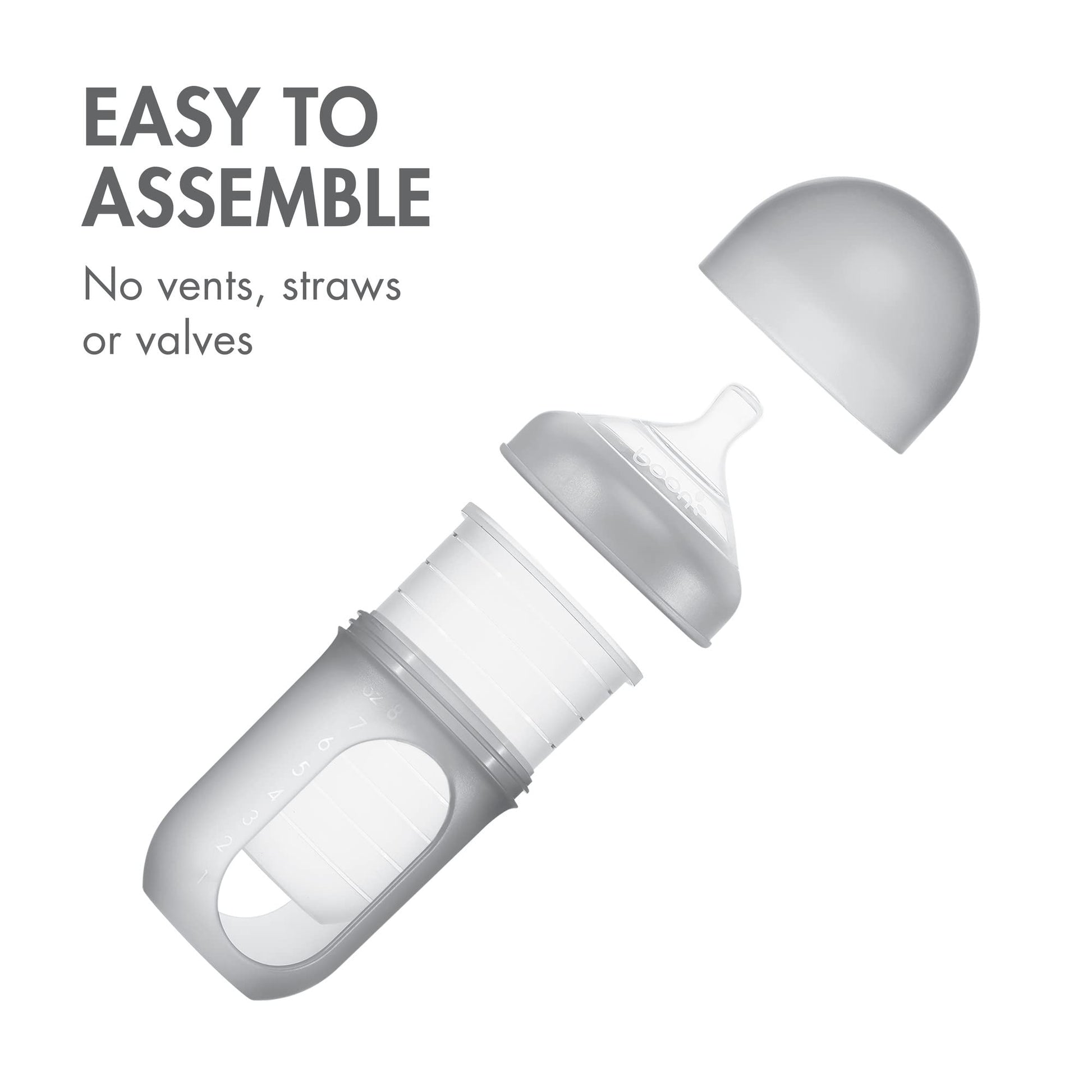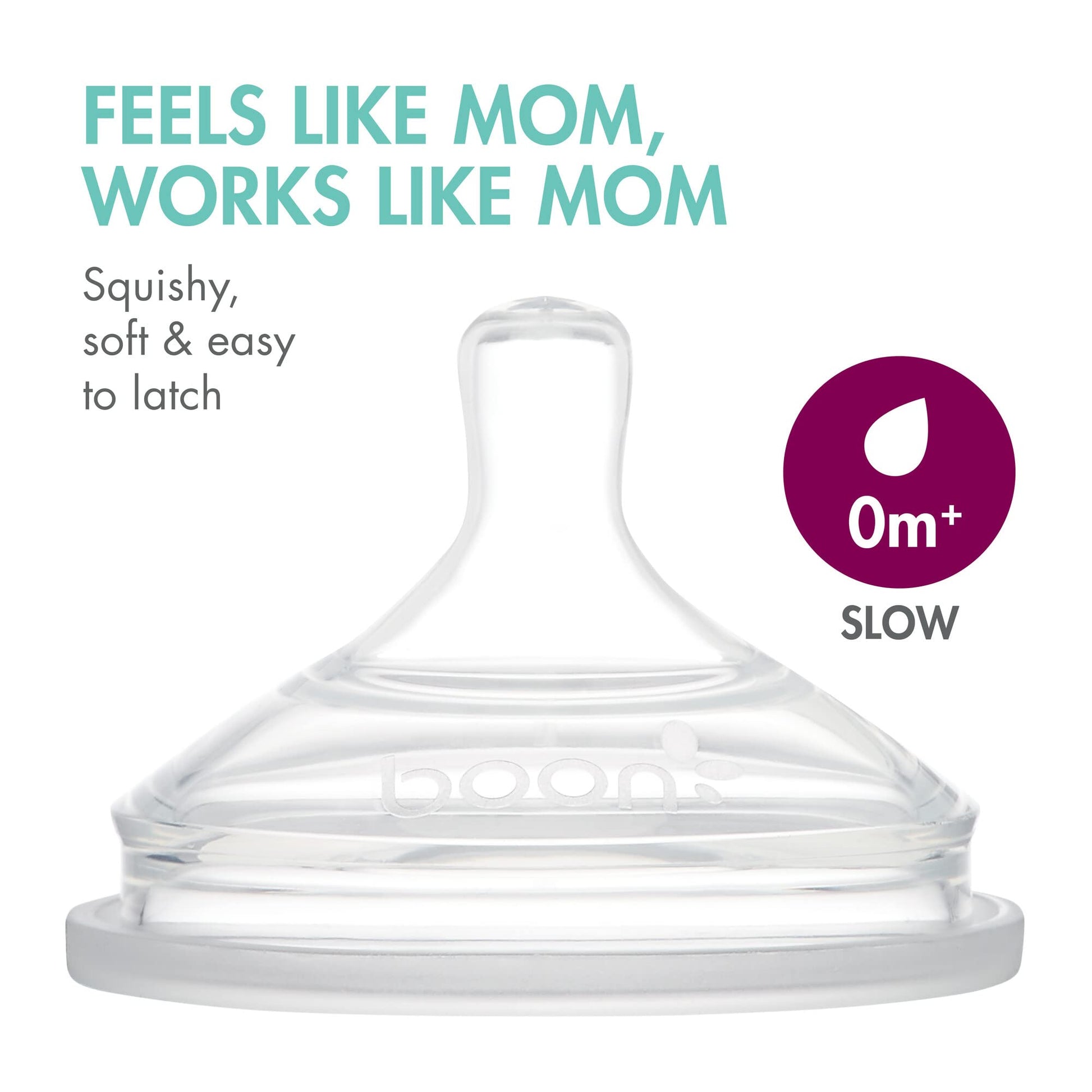 KICK COLIC TO THE CURB! Boon Nursh bottles feature a revolutionary air-free feeding design with a 100% silicone pouch that collapses as your little one drinks, helping prevent colic symptoms like gas and spit up. Other baby bottles use vents or valves that introduce air into milk to help it flow, NURSH doesn’t need any of that. Our silicone pouch collapses as baby drinks, mimicking breast feeding with no added air. The silicone material is also safe for boiling, sterilizing, and freezing, making it easy to get ready for each feeding session for your little one. As a bonus, no vents or valves make it a snap to clean with a dishwasher-safe design and assembly that takes a matter of seconds. After all, who wants to prepare a complicated bottle at 2 am? Nursh’s optimal bottle nipple shape and length are easy for your baby to latch on to Separating the pouch and the plastic shell in Nursh's patented design ensures your baby's milk never touches plastic, only food-safe silicone. Each Nursh bottle is BPA and PVC free.