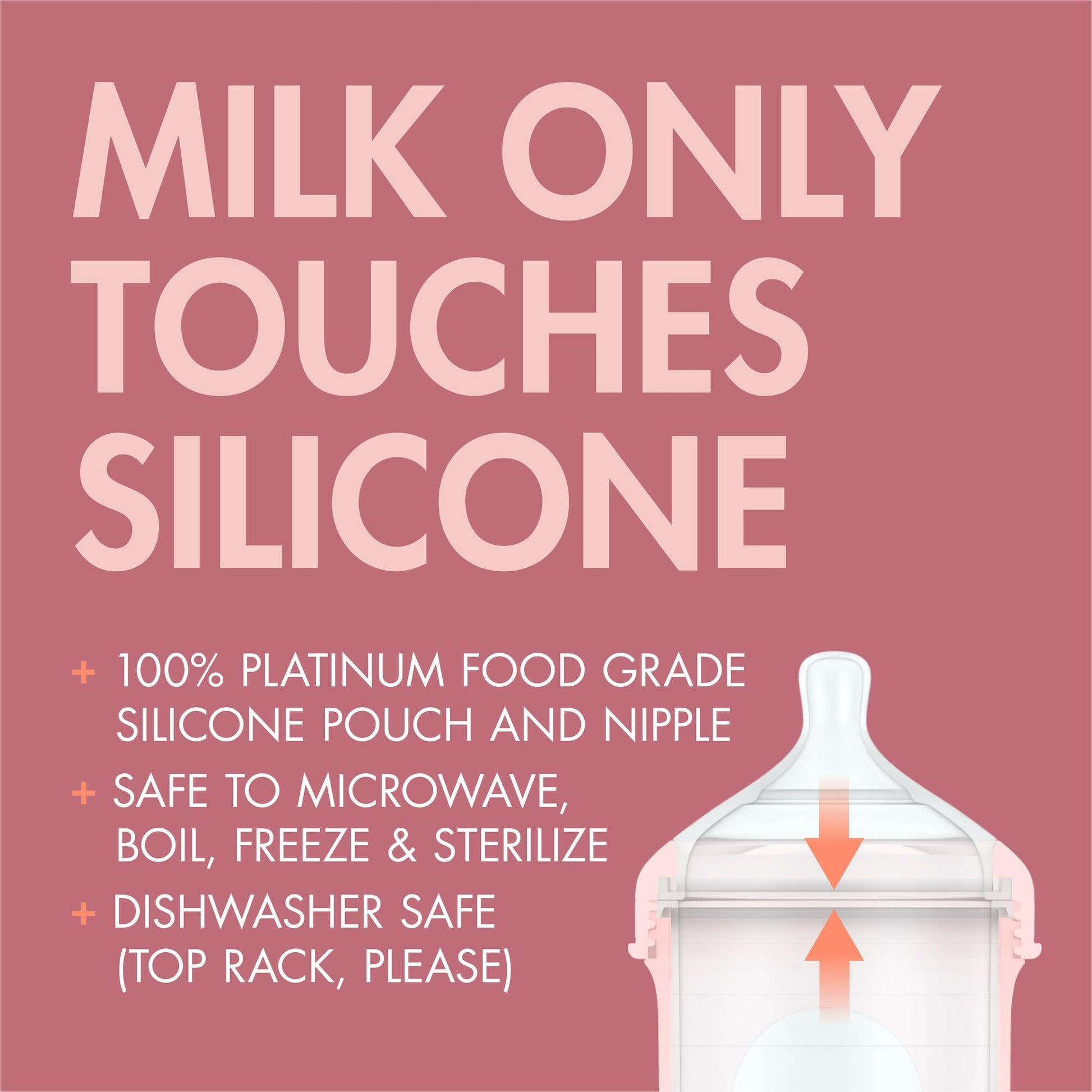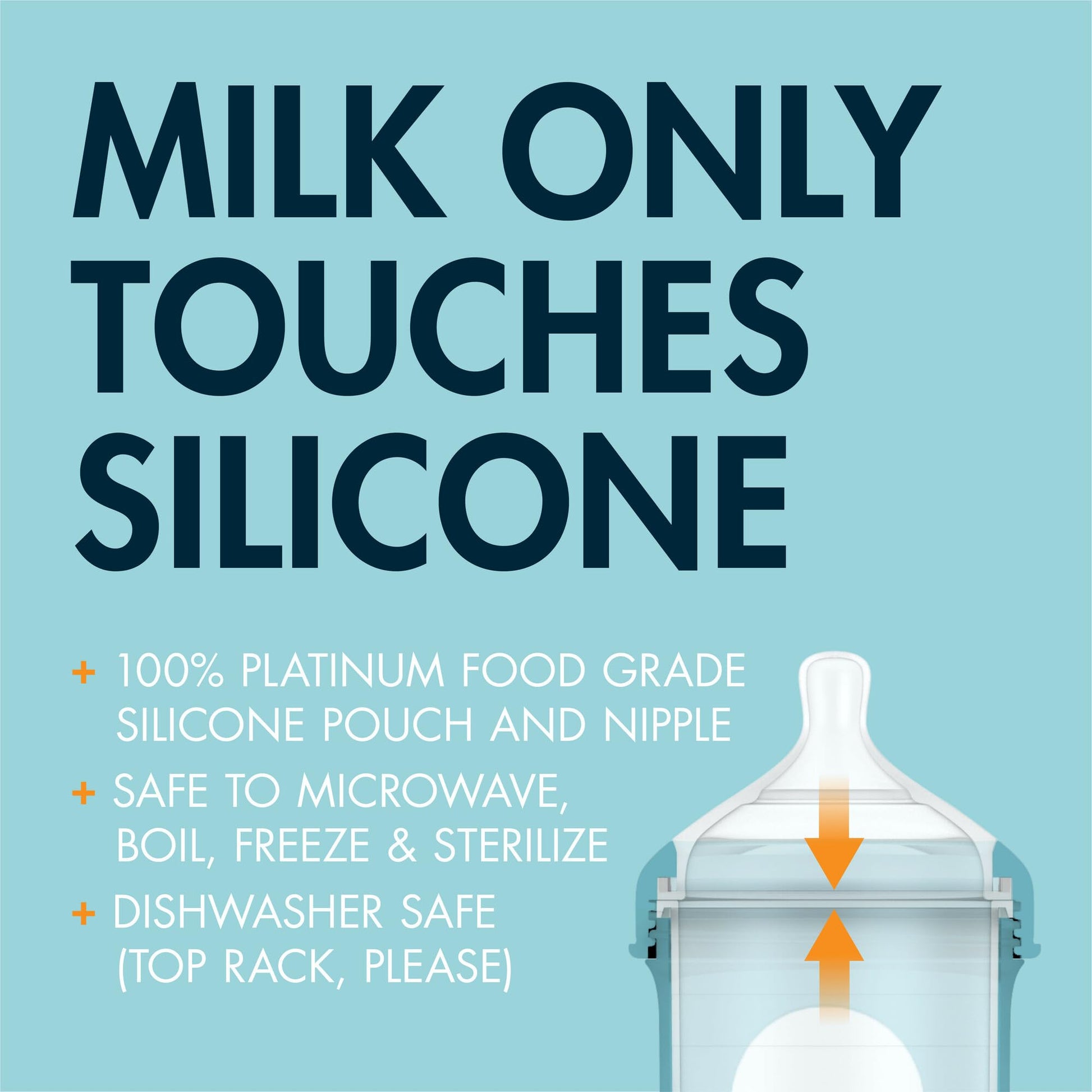 - Safety of Silicone: The only thing your baby's milk comes in contact with is the 100% food-safe silicone of the nipple and pouch; made without BPA or PVC