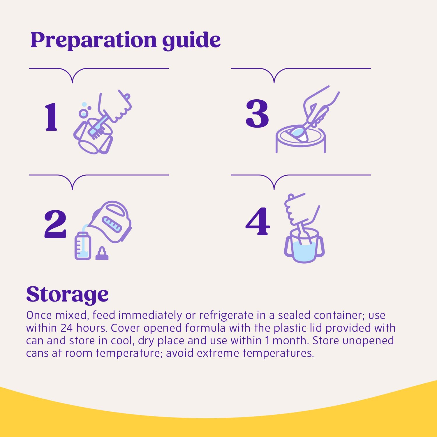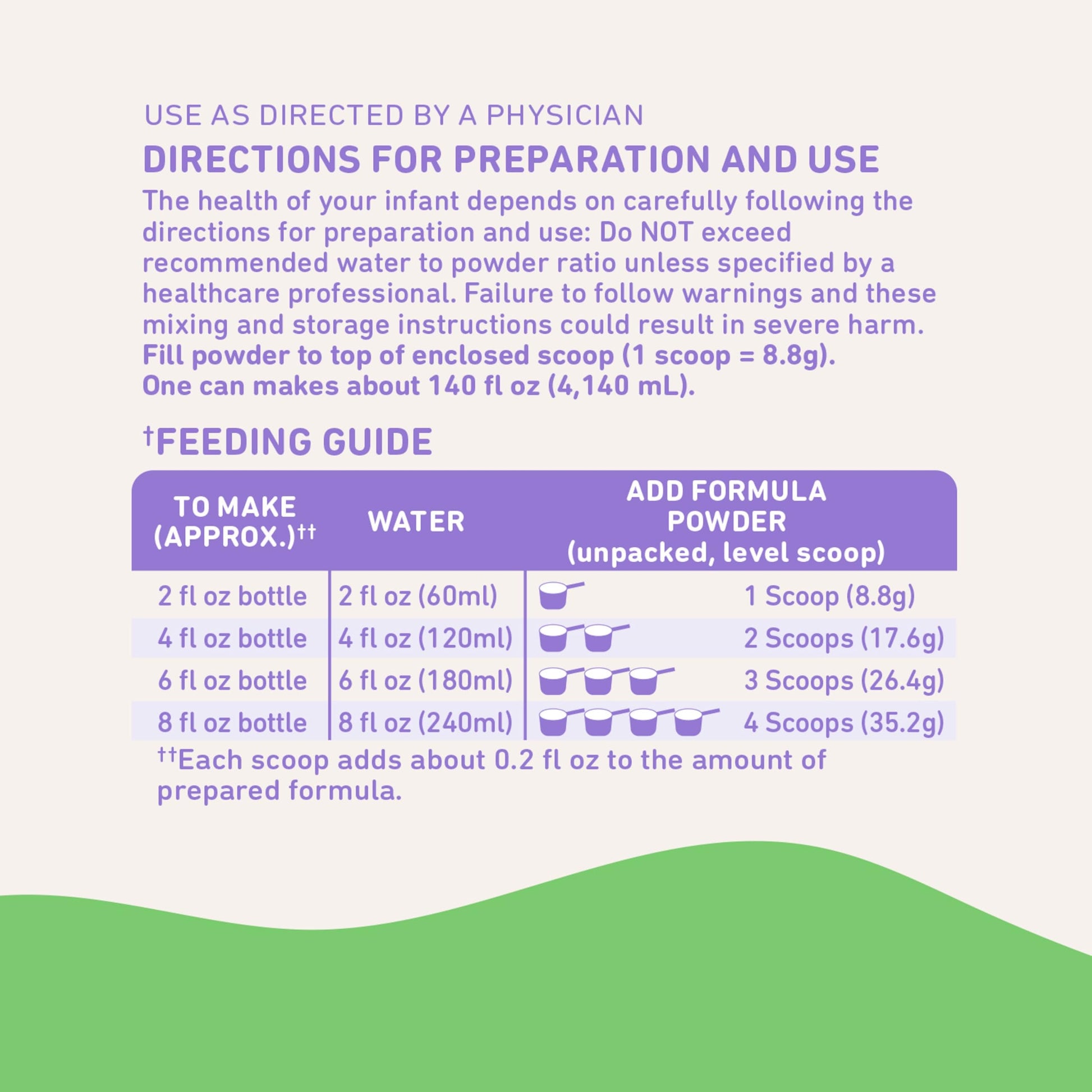 - PREPARATION INSTRUCTIONS: Wash hands, bottle, feeding utensils and surfaces with soap and water. Add powder using 1 unpacked, level scoop for each 2 fl oz of water. Cap bottle, shake well until powder dissolves. Discard unrefrigerated formula after 1 hour
