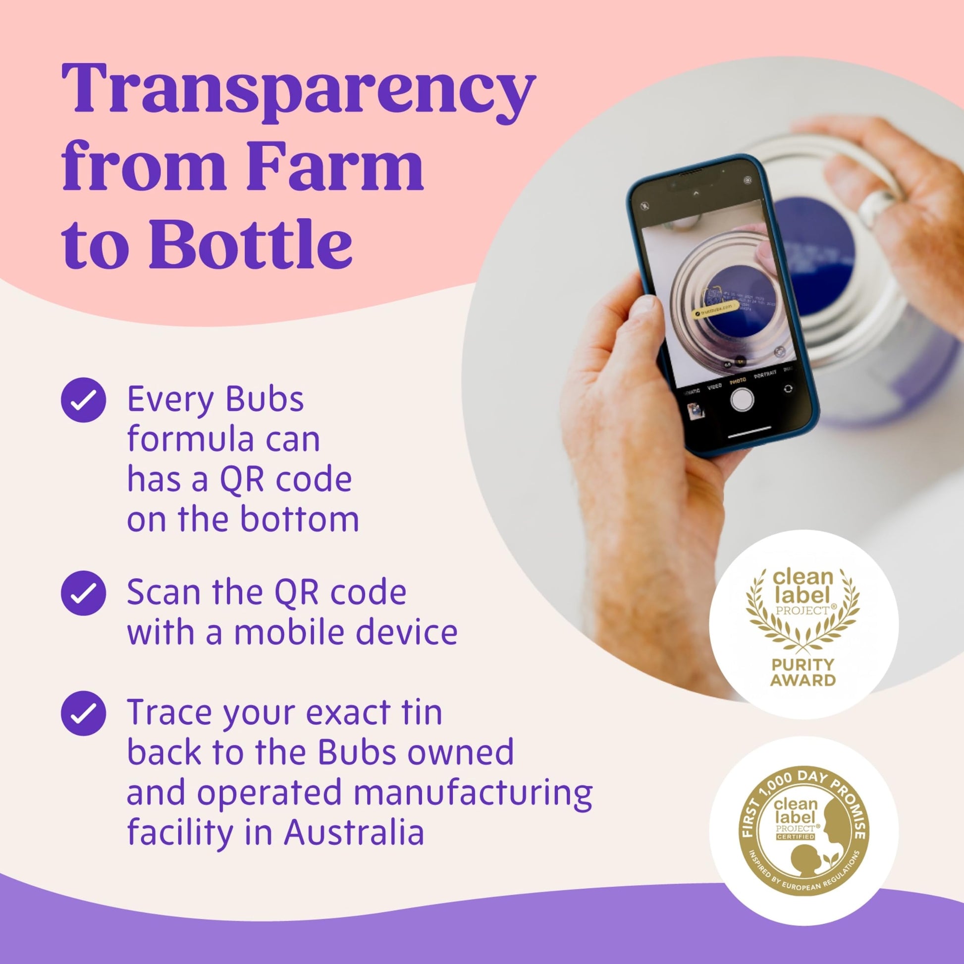 Each of our farmers are carefully selected to meet strict quality control and transparency protocols. Our Bubs manufacturing facilities comply with all Australian State & Federal Regulatory and export quality control requirements. Our Bubs formula products are produced in our Bubs-owned and controlled manufacturing facility in Australia, including our Bubs Toddler Formulas and rigorously tested for microbiological parameters before being approved for release.