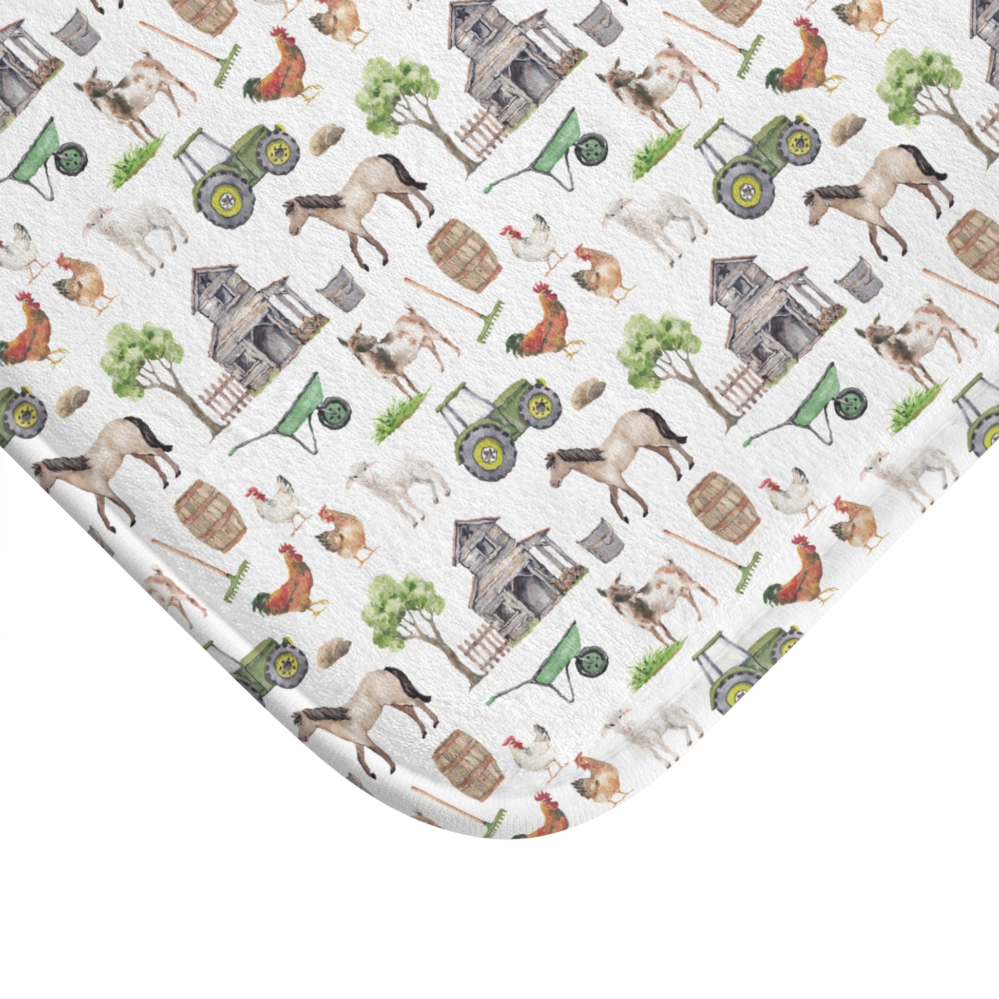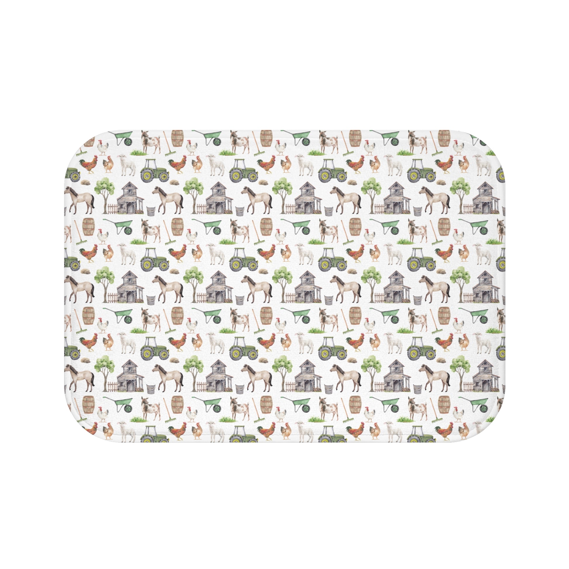 Farm Life Children's Bath Mat featuring a cozy and rustic design perfect for kids' bathrooms. This bath mat provides comfort and support to little feet while preventing slips and falls. Ideal for families living in rural areas or those who love farmhouse decor. Great for decorating kids' bathrooms during the fall season or any time of year.