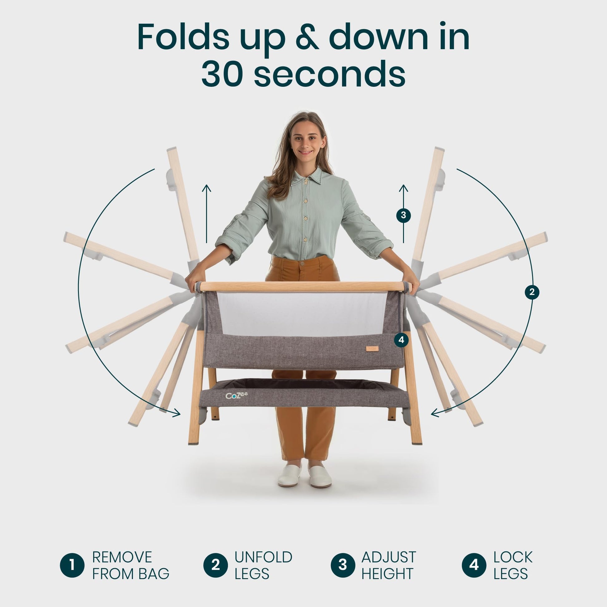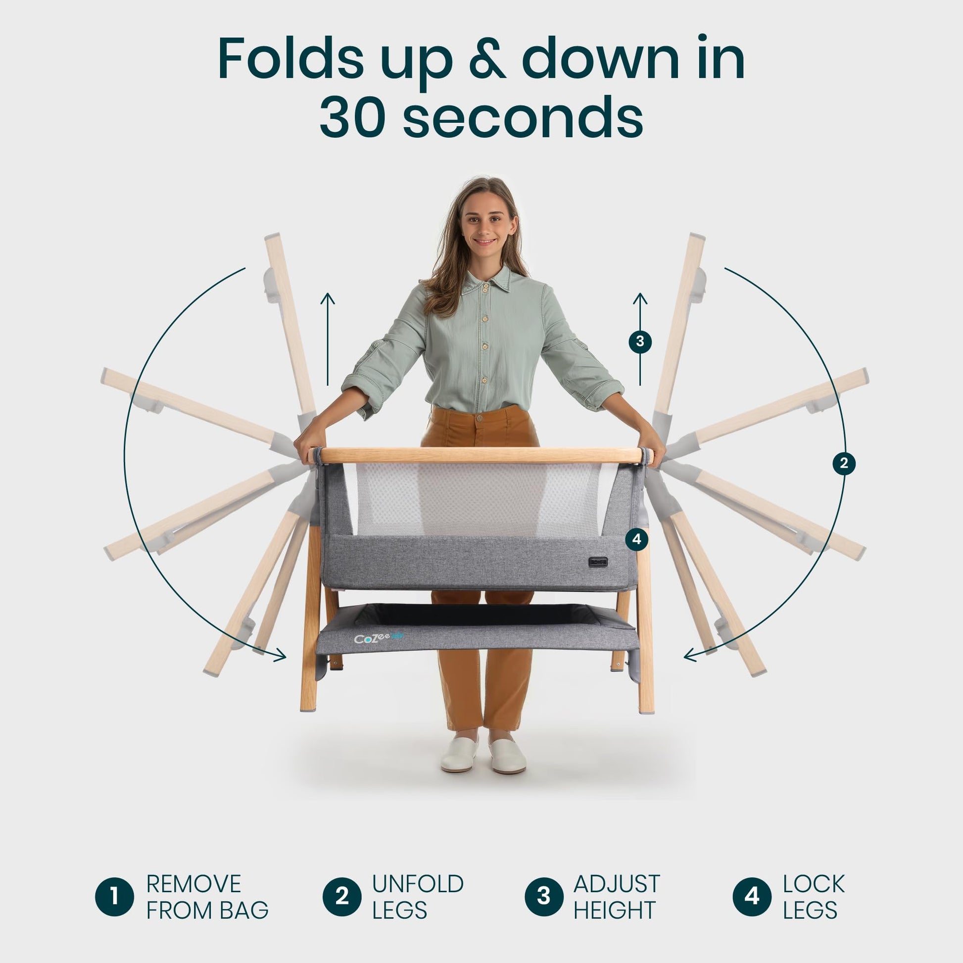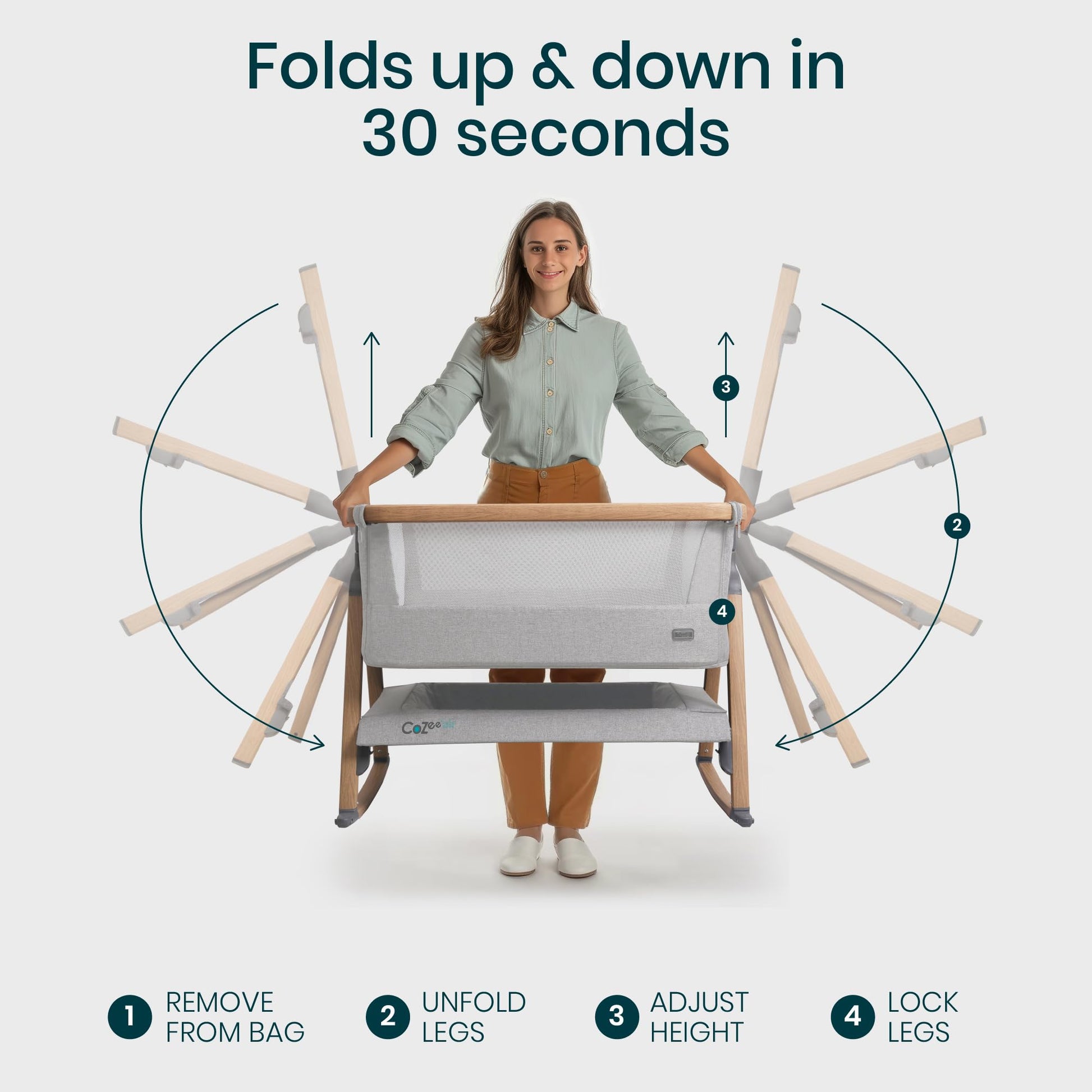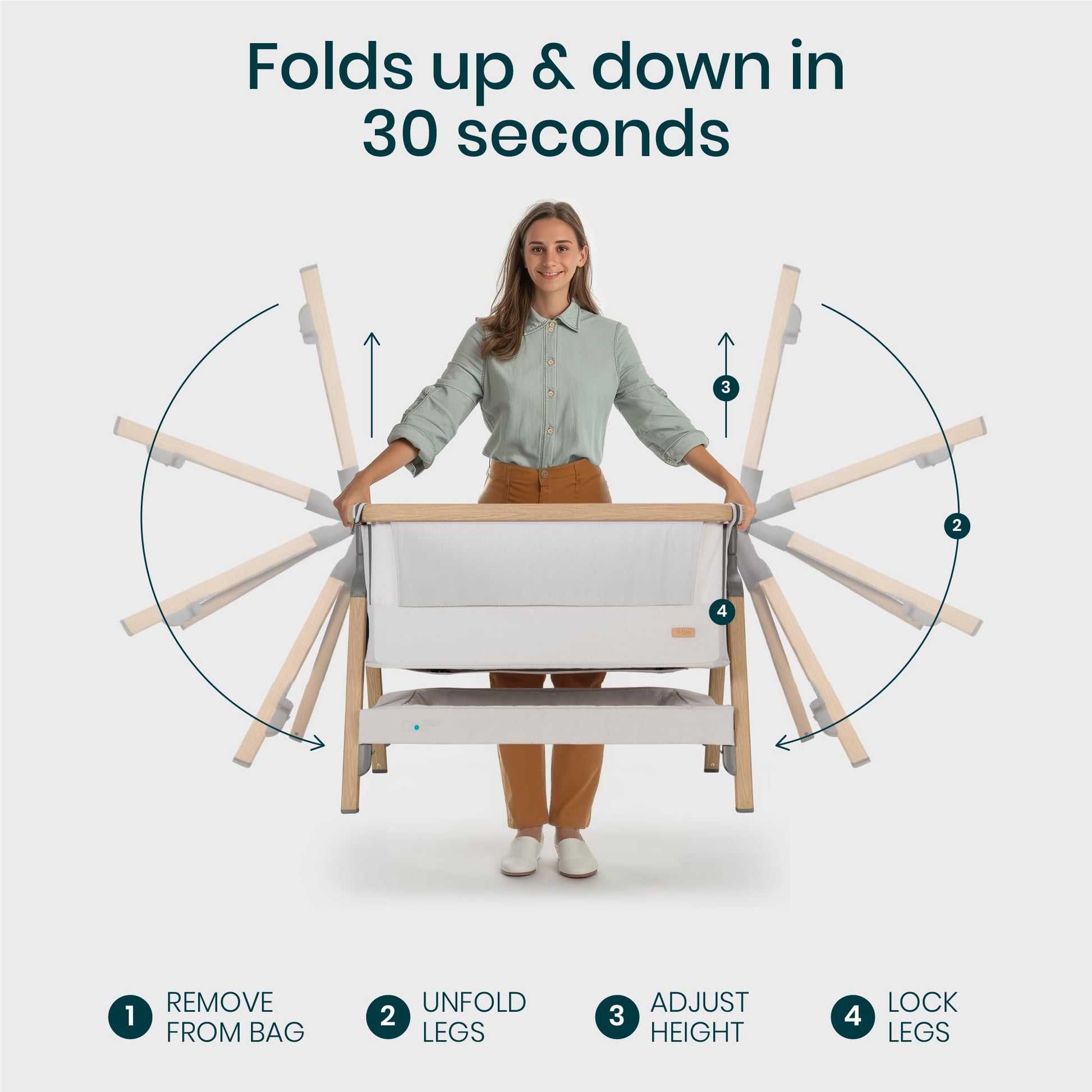 - SET UP IN 30 SECONDS - Thanks to our innovative fast-folding mechanism, the baby bedside bassinet is ultra quick to set up! The wood-effect legs lock securely into place to keep the bedside crib stable.