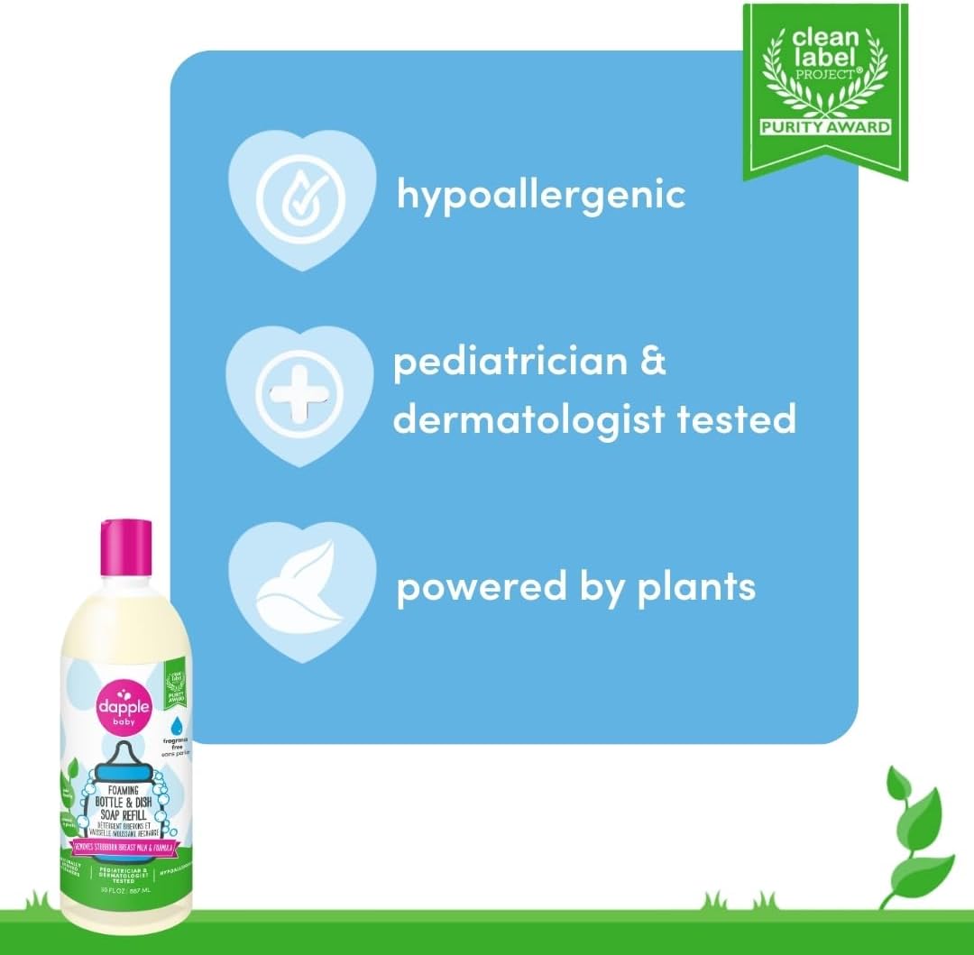 - MINDFUL INGREDIENTS: Dapple Baby Foaming Bottle & Dish Soap is pediatrician and dermatologist tested, hypoallergenic, made with plant powered ingredients and without parabens, sulfates, phthalates, mineral oil, synthetic dyes & fragrances, chlorine, alcohol, SLS, SLES, MEA, DEA, TEA.