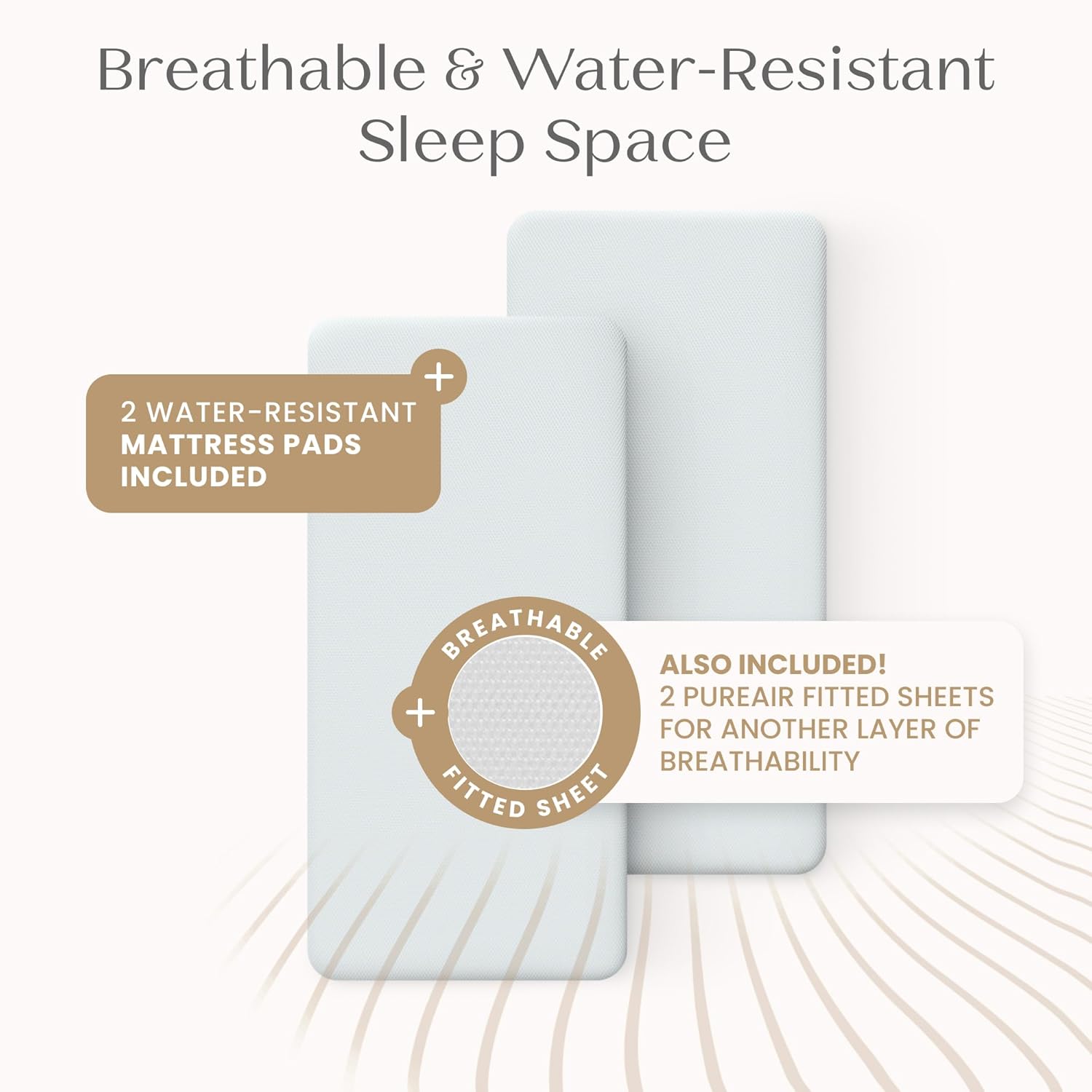 - OPEN AIRFLOW: Mesh sides provide open airflow and clear view of your twins | Bassinet includes two PureAir Fitted Sheets that allow air to flow through the fabric and under your babies to help maximize airflow between them and the mattress pad for a safer and more comfortable sleep