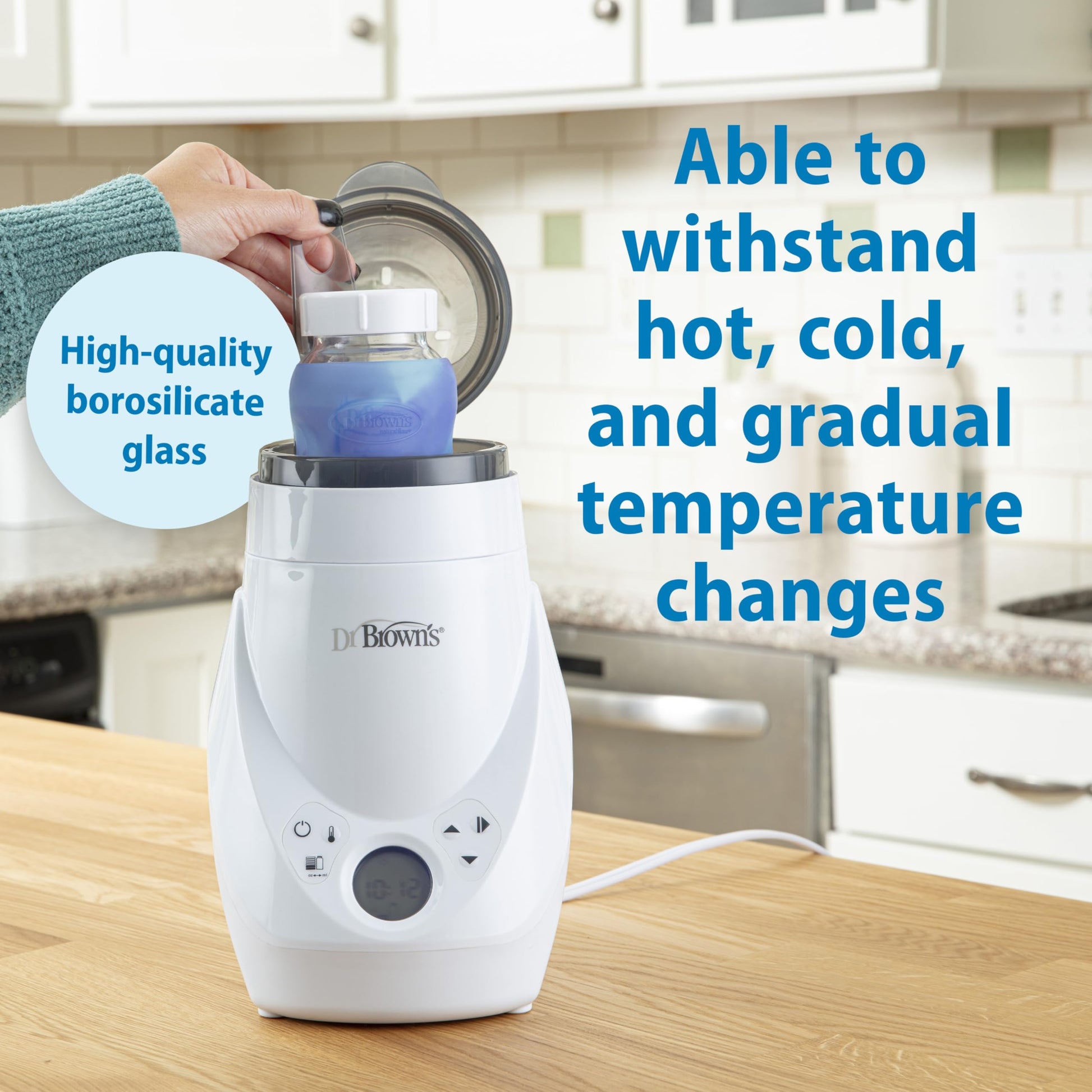 Your options have never been better with Dr. Brown’s Natural Flow® Anti-Colic Options+™ Wide-Neck Glass Baby Bottle. The anti-colic internal vent system is clinically proven to reduce colic. Dr. Brown’s® bottles provide a more comfortable feeding experience for baby by decreasing spit-up, burping and gas. This vacuum-free feeding is closest to breastfeeding and Dr. Brown’s® silicone nipples provide a consistent flow so baby can feed at their own pace. The breast-like nipple shape encourages a proper latch for a more natural bottle feeding experience and eases the transition from breast to bottle and back again. Dr. Brown’s vent system is proven to help preserve bottle milk nutrients and aids in digestion for a better night’s sleep. The silicone nipple, together with the internal vent system, offer a reliable and trusted bottle feeding experience that makes Dr. Brown’s the #1 Pediatrician Recommended Baby Bottle in the U.S.* Dr. Brown’s® Glass bottles are heat and thermal shock-resistant, which can withstand hot and cold temperatures, along with gradual temperature changes. Made to grow with baby, our bottle is designed to nourish through all of baby’s feeding stages and is recyclable. Safe for use in dishwasher (top rack only), electric and microwave sterilizers or boiling water. BPA Free.