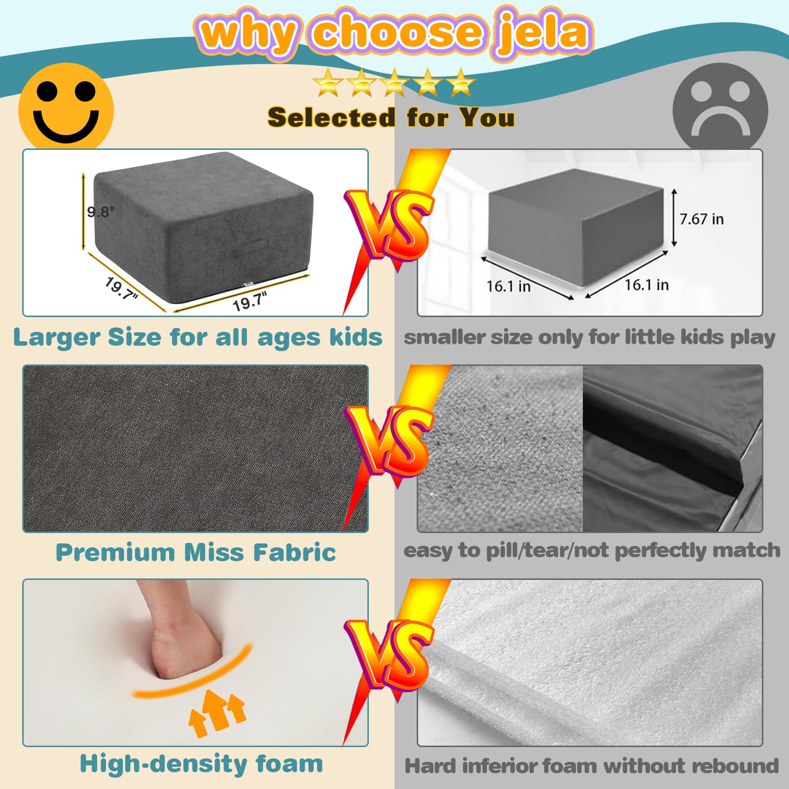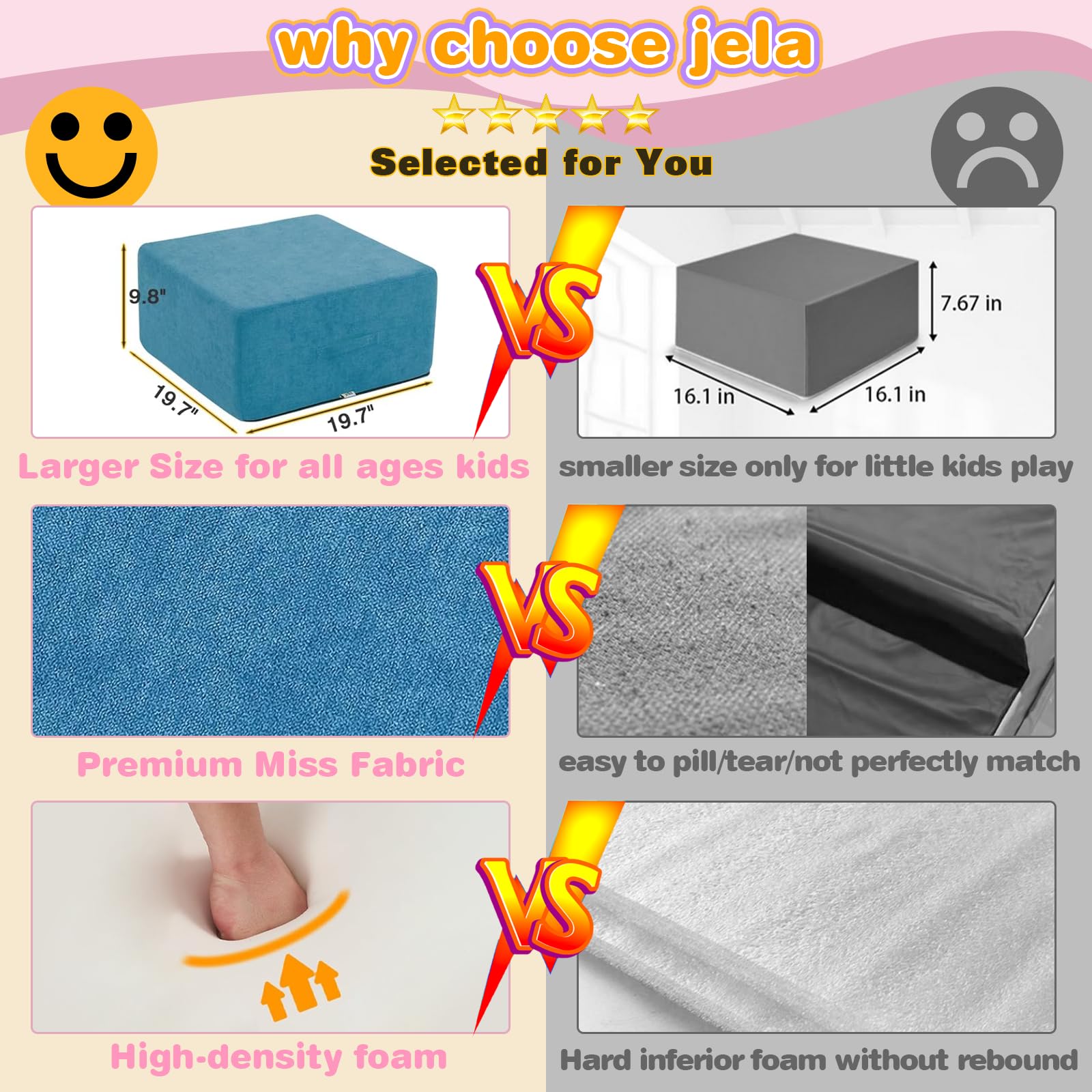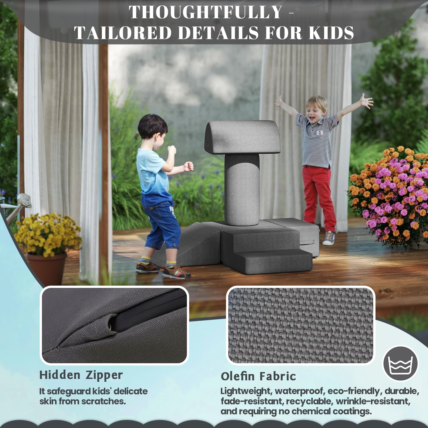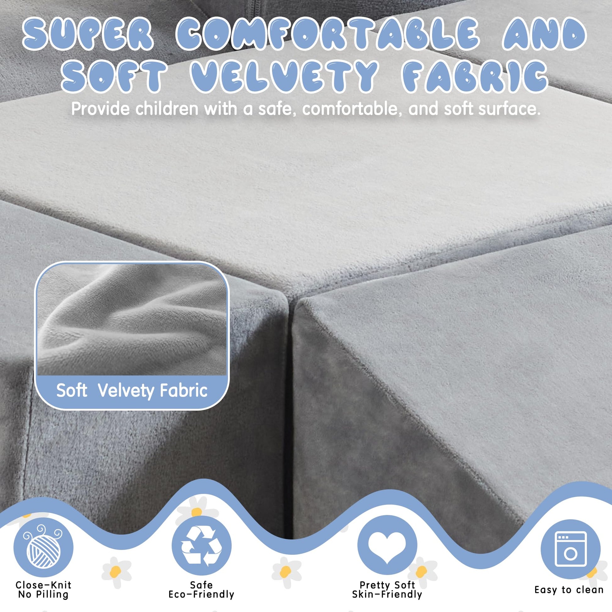 - Waterproof and Stain-resistant Fabric:The jela climbing blocks with upgraded Olefin waterproof fabric have dual protection against moisture and UV rays. This soft play set can be placed freely in children's rooms, on terraces, or in courtyards, allowing children to play without restrictions. In the face of situations like juice spills or mud stains, they can be easily wiped clean, continuously creating a hygienic play environment for children.
