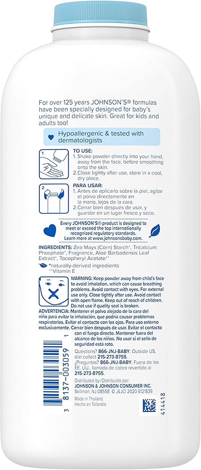 Johnson's baby powder with naturally derived cornstarch and Aloe & Vitamin E gently absorbs moisture to soothe baby's delicate and unique skin and leaves it feeling soft and smooth. Specially formulated for babies and infants, this soothing baby powder is dermatologist tested and clinically proven mild and gentle. This hypoallergenic baby powder is free of parabens, phthalates, dyes, and harsh fragrances. Formulated to be gentle, never harsh, this lightweight cornstarch baby powder for baby skin care has a silky texture for easy application. It's great for kids and adults, too! To use this infant baby powder, shake powder directly into your hand away from the face before smoothing onto skin. Close the baby powder container tightly after use and store in a cool, dry place.
