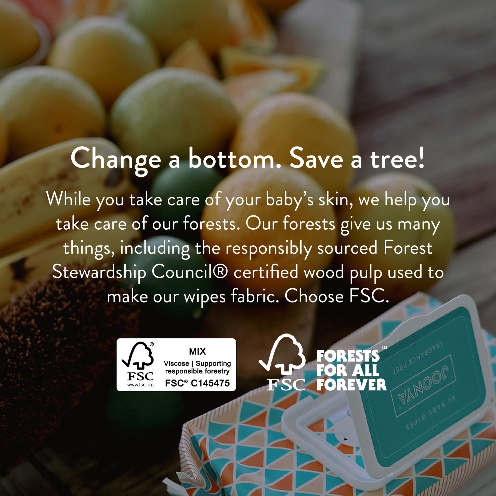 - EARTH-FRIENDLY, BIODEGRADABLE WIPES: Joonya's biodegradable wet wipes are also compostable. Our fragrance free baby wipes are made with FSC 100% certified viscose, a mark of sustainability that ensures wood used is sourced from responsibly forestry.