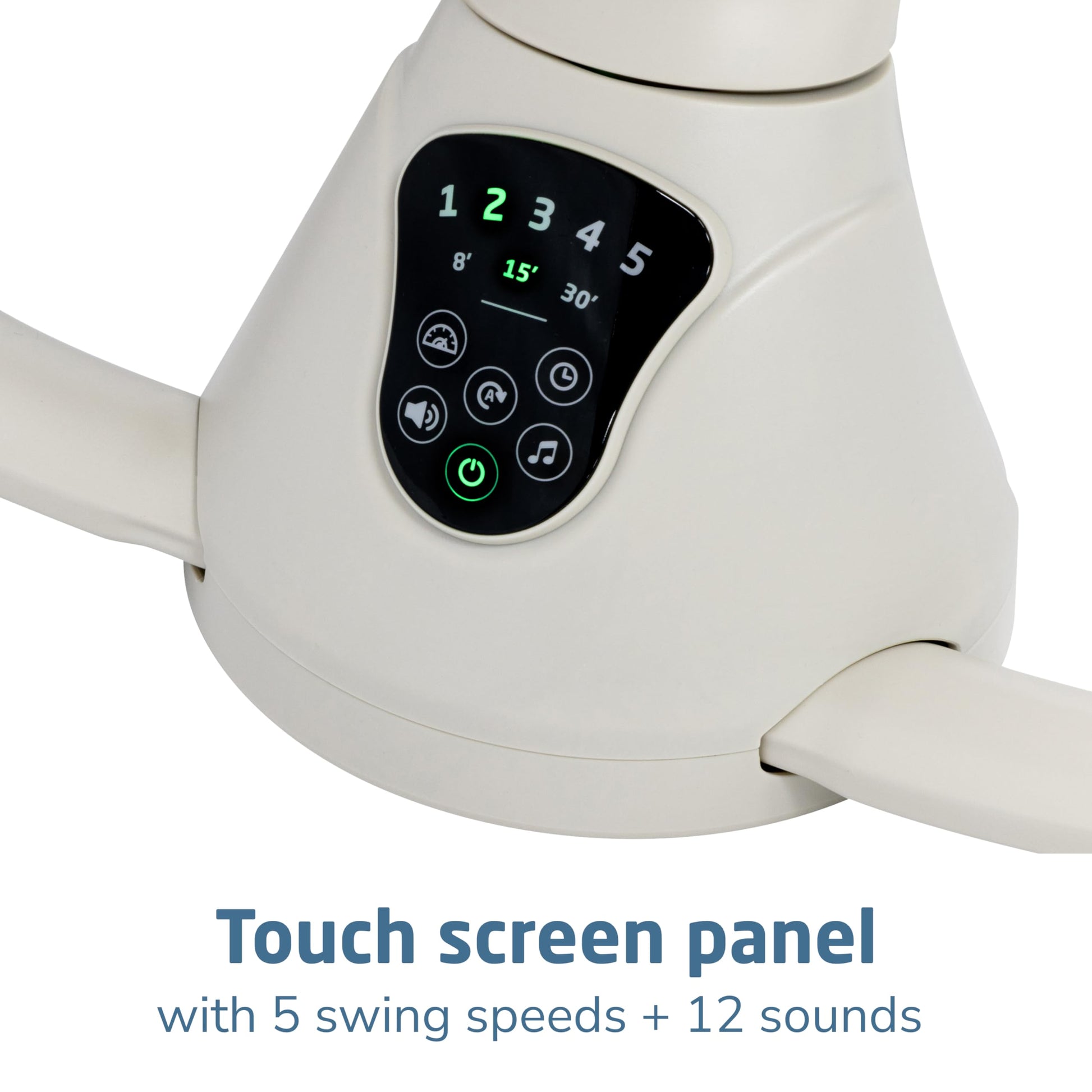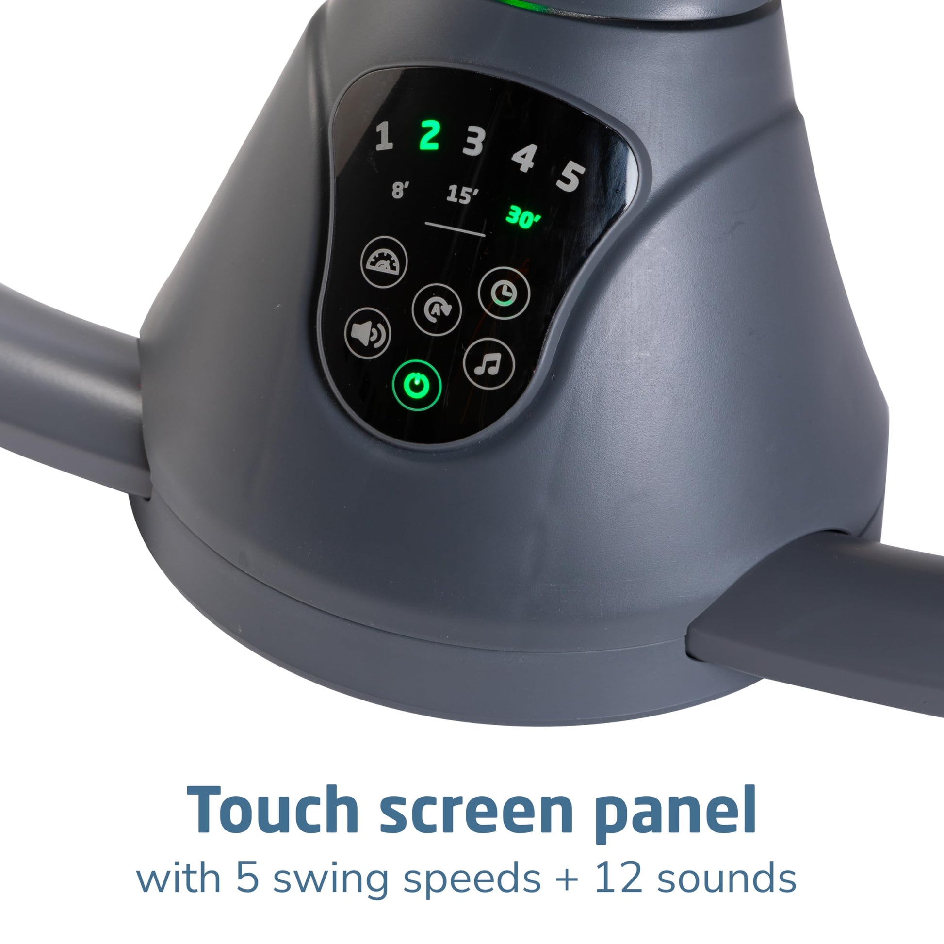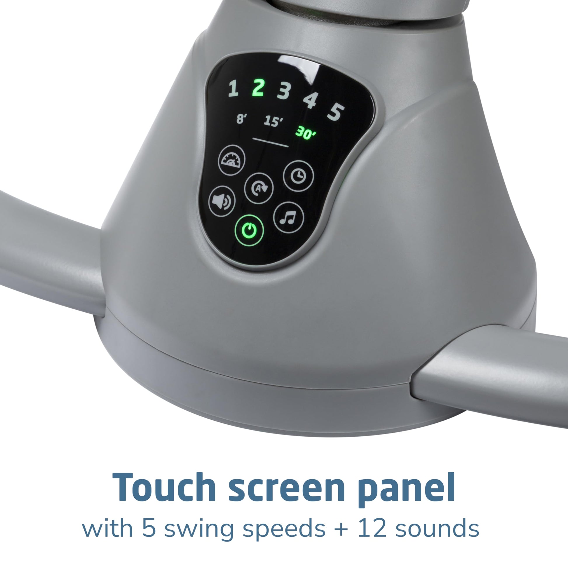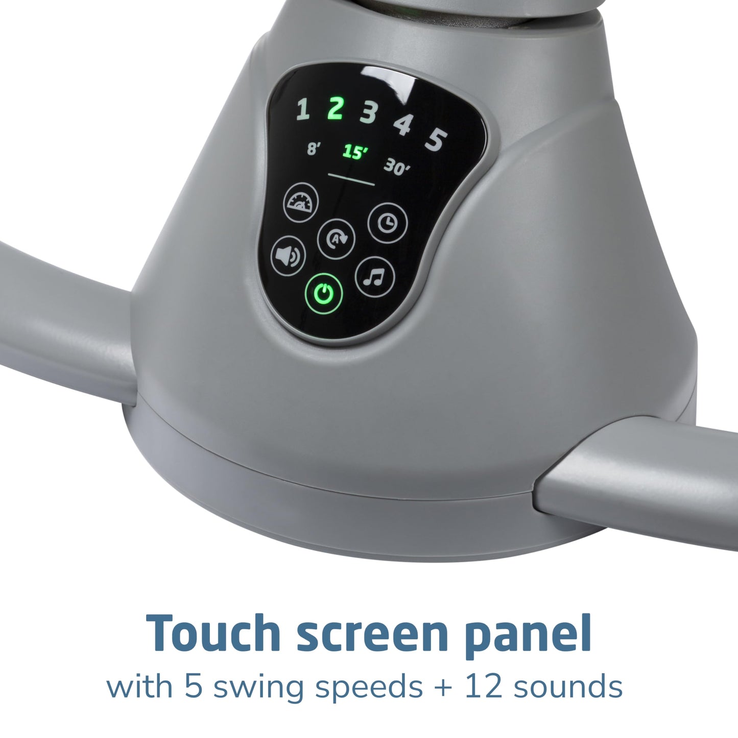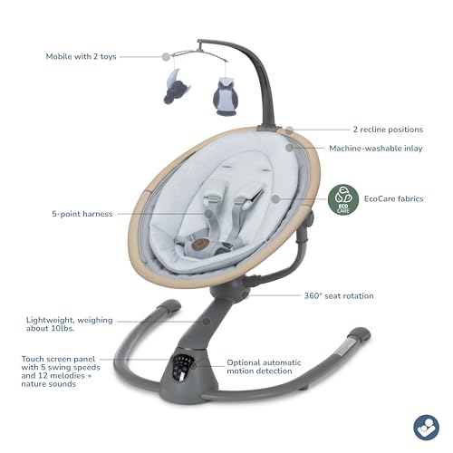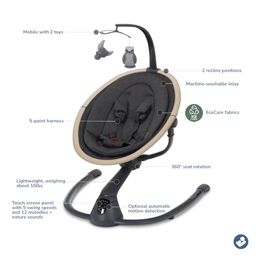 - SET THE MOOD WITH THE TIP OF YOUR FINGER: Easily customize the compact baby swing's settings with the smart built-in touch screen panel, selecting from 5 swing speeds and 12 melodies and nature sounds.