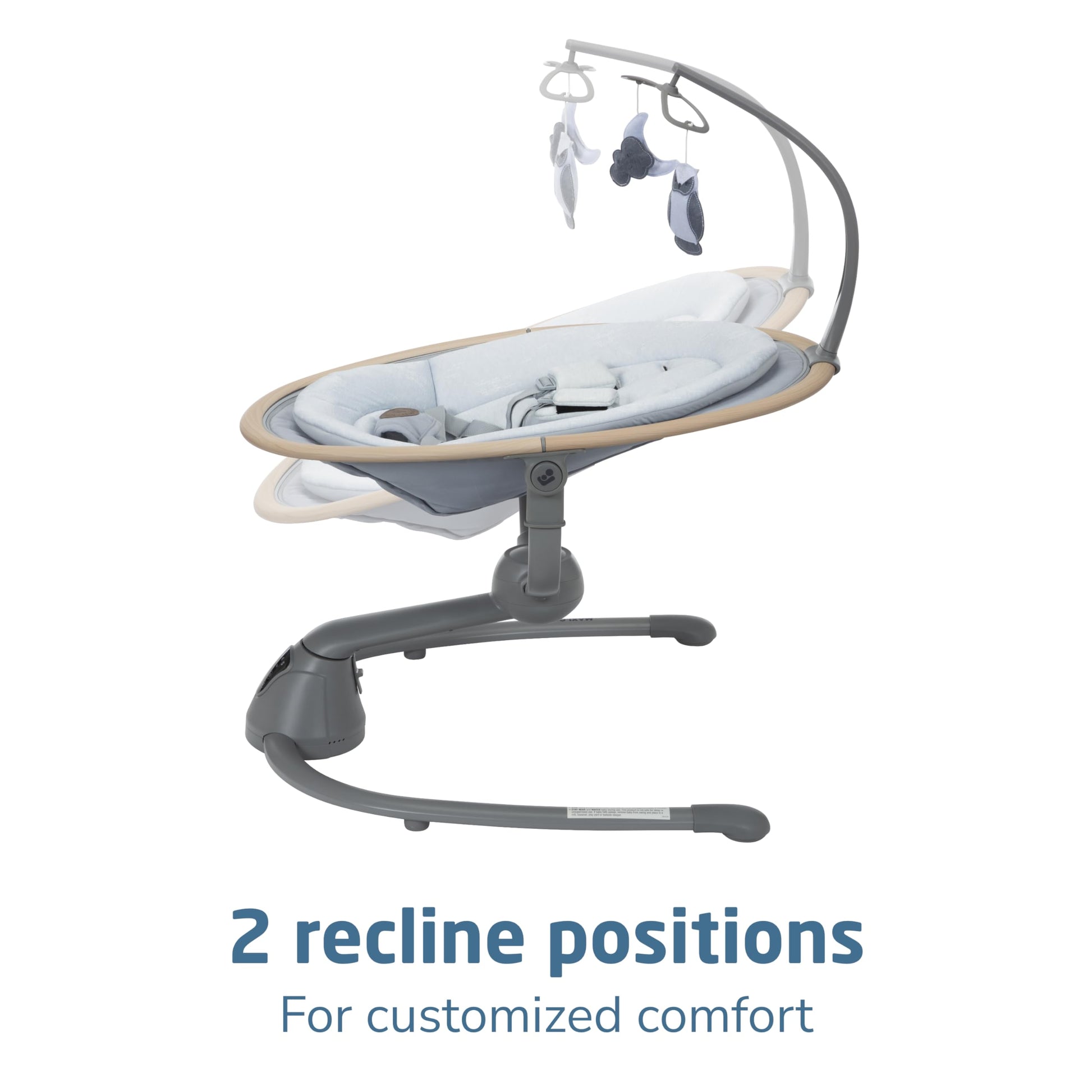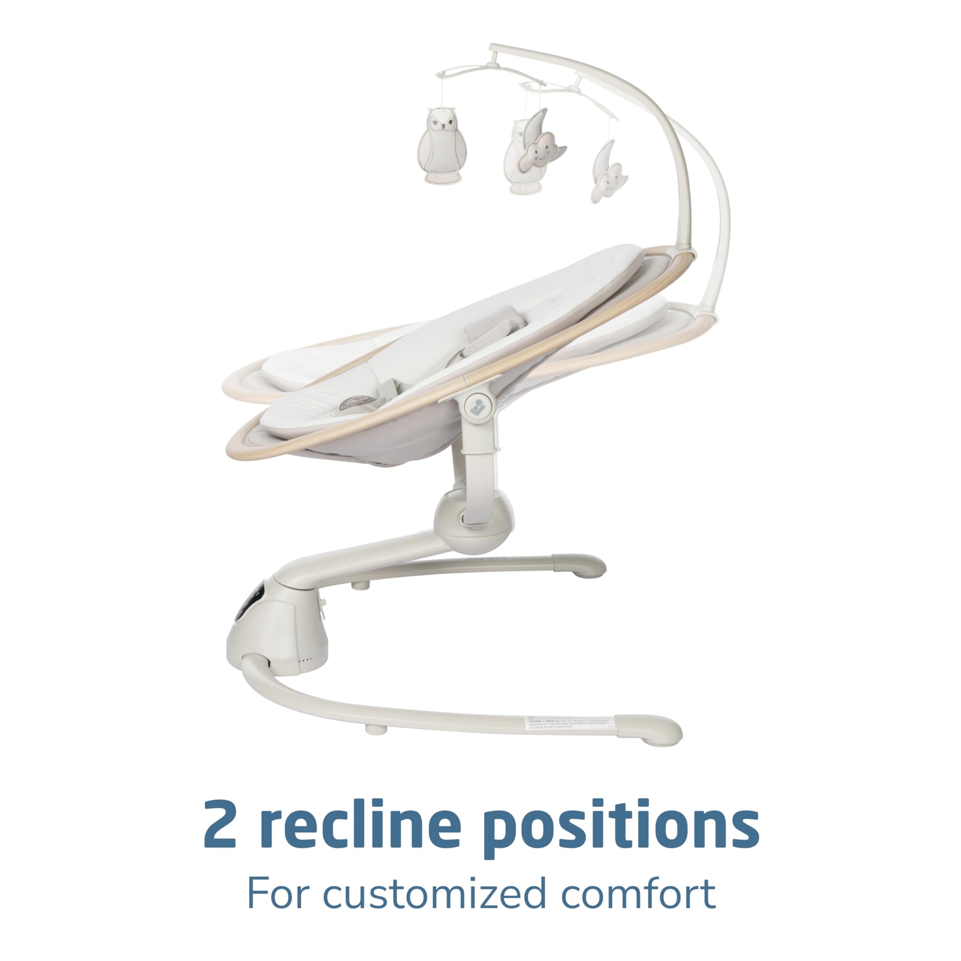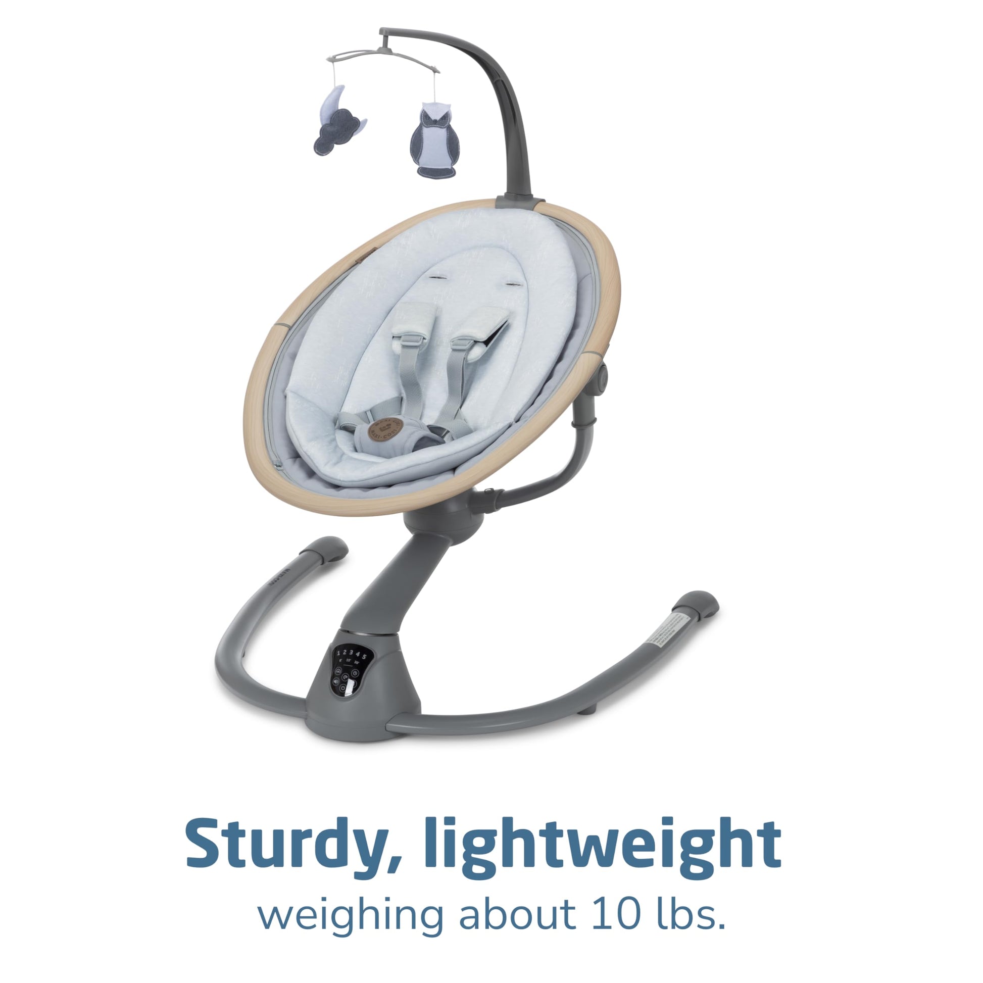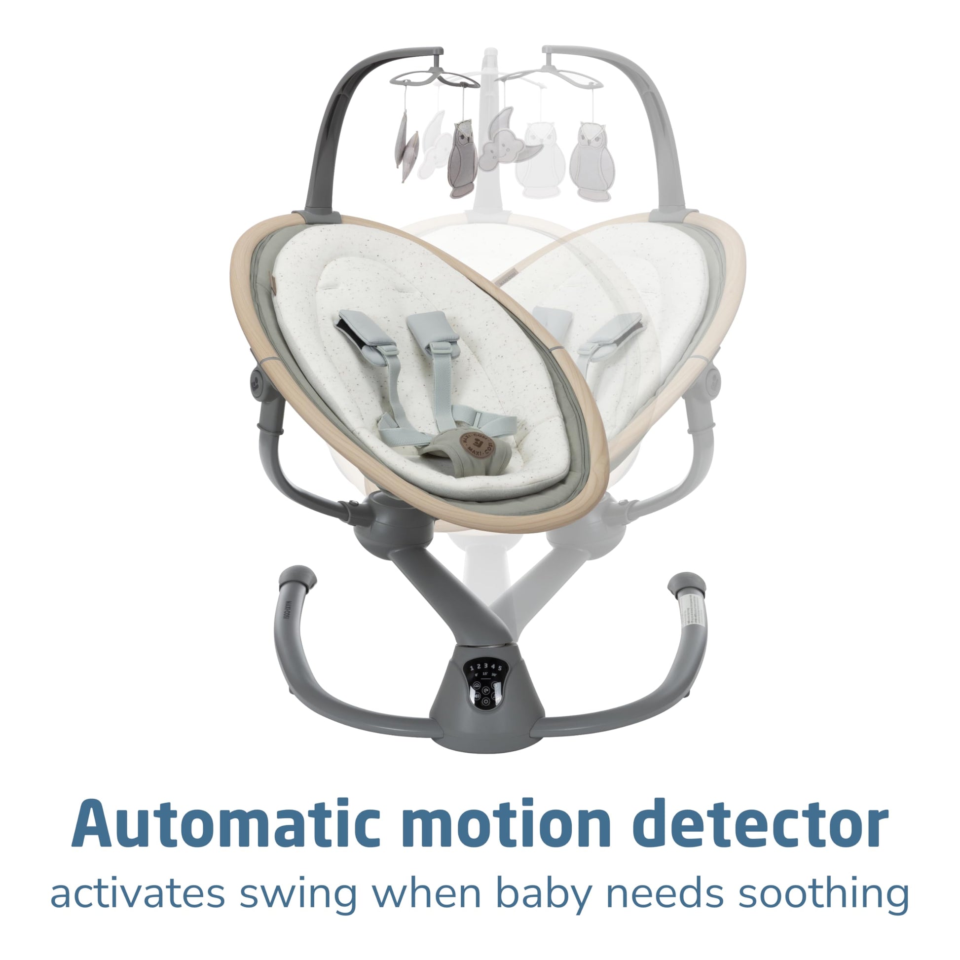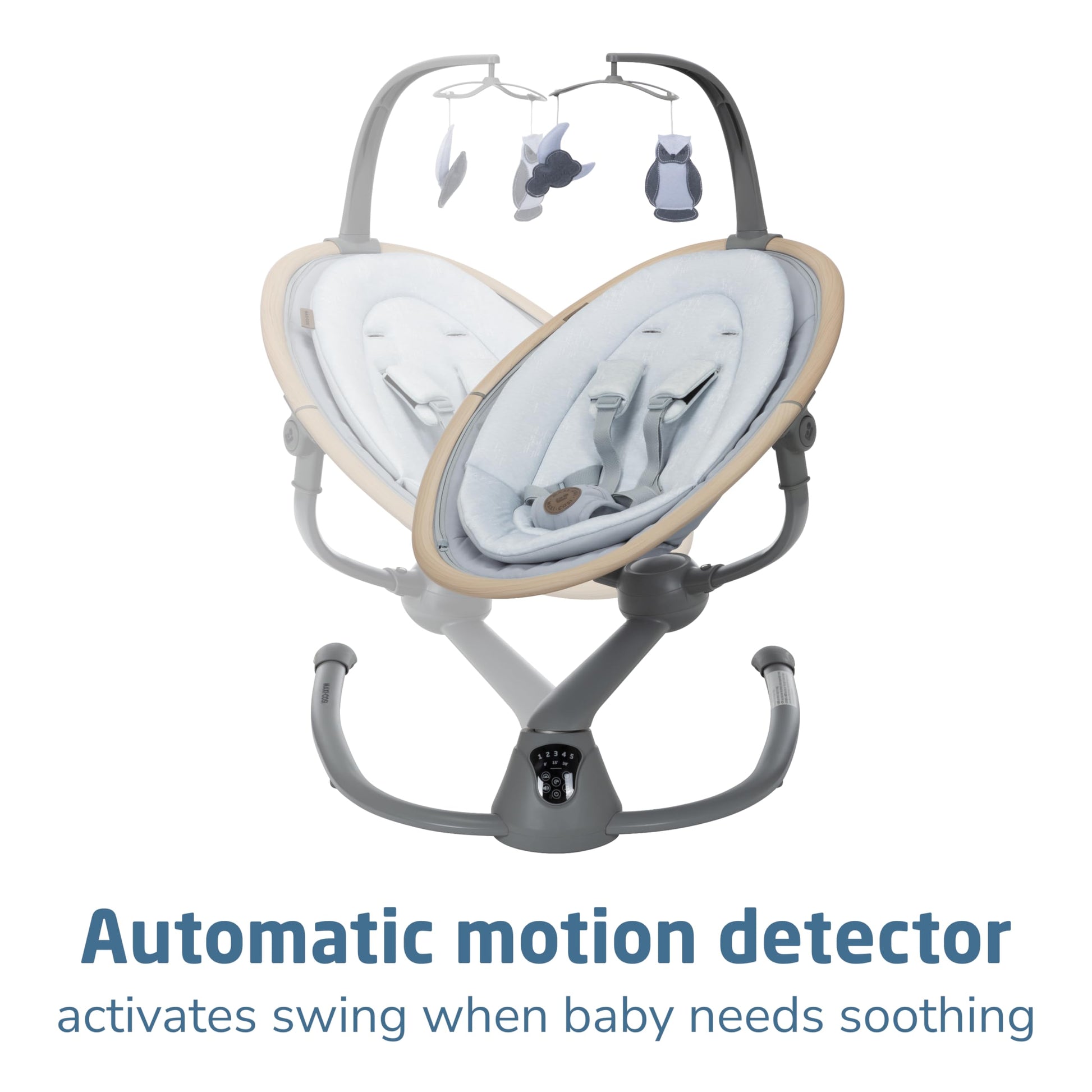 The Cassia Swing is designed to give you freedom and flexibility while comforting your little one. This smart, portable baby swing offers a stationary baby swing option and features an automatic motion detector that activates the baby swing chair when your infant needs extra soothing. The baby swing seat rotates a full 360°, giving your curious cutie more sights to take in, ensuring everyone stays connected. The built-in touch screen panel allows you to select from 5 swing speeds, plus 12 melodies and nature sounds. The Cassia Swing makes a great baby swing indoor option. Crafted with EcoCare, our future-friendly, 100% recycled fabric made from plastic bottles, the yarn produced is soft, comfortable, and breathable–ideal for your little one. The baby swing’s 2 recline positions offer ultimate relaxation, while the soft newborn inlay keeps baby comfy. The removable fabrics, including the newborn inlay and cover, are machine washable for quick and easy cleaning. This newborn swing is also lightweight and foldable, weighing only about 10 lbs, making it easy to transport and store. Additionally, this swing includes 2 felt mobile toys to keep your baby entertained, and its sophisticated, modern color palette blends beautifully with any décor. Ideal for babies up to 20 lbs., the Cassia Swing adds tranquility to a busy day by providing soothing comfort for your baby and convenience for you, enhancing your quality time at home. Remember, never let babies sleep in rockers, bouncers, or swings. The Cassia Swing is a great choice when looking for baby swings for infants with baby toys attached.