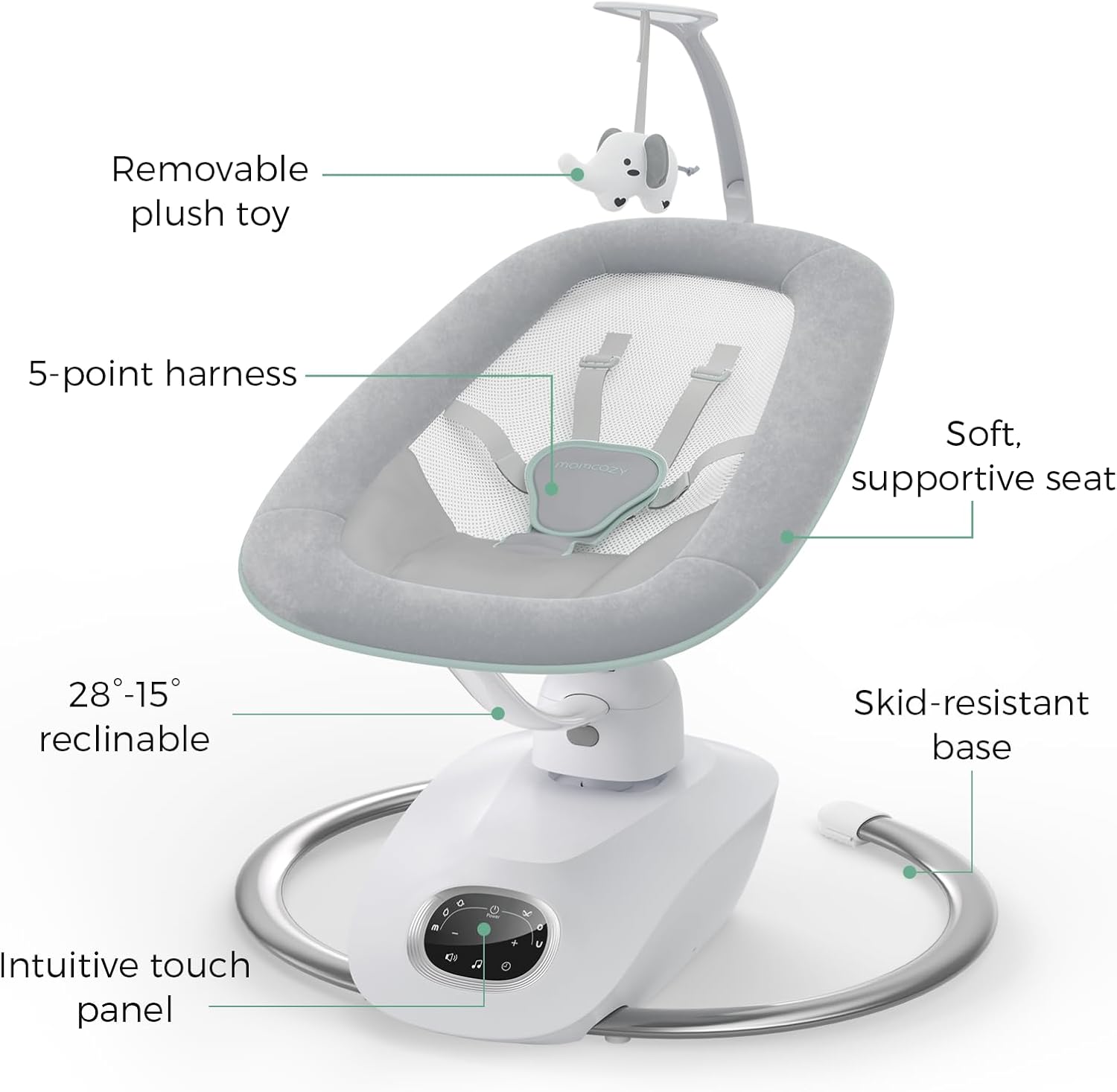 - Tailored Movement Options: Combining side-swaying, bouncing, and figure-eight glides with creatively inspired M, O, and U motions, this swing offers four speed settings to suit your baby's mood—whether winding down or staying entertained