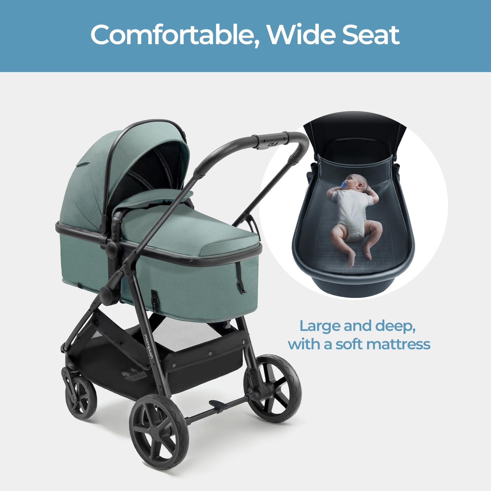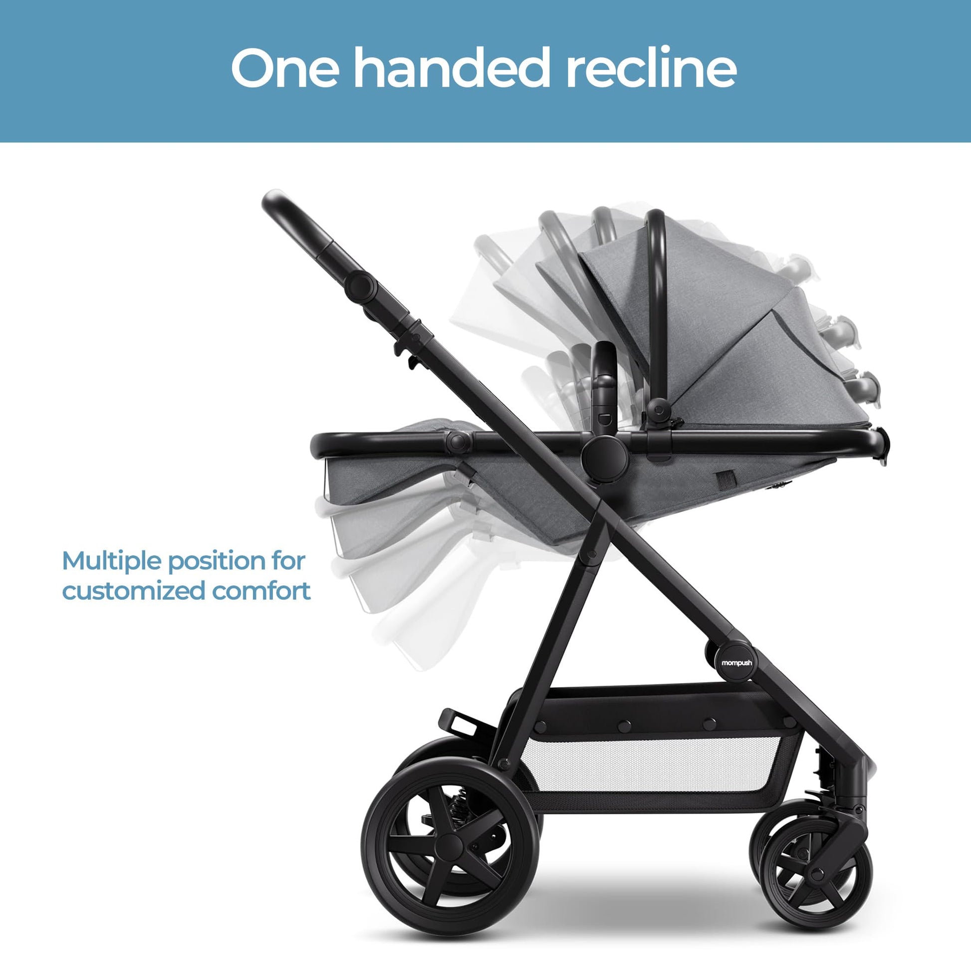 - Room to Grow: Use from birth (Compatible with Maxi-Cosi and Nuna car seats, car seat adapter SOLD SEPARATELY). Get an infant stroller that transforms to match the sprouting of their little limbs. This Mompush stroller provides a secure ride throughout early development. You can go from stroller to bassinet in minutes, with full recline for a comfy newborn ride