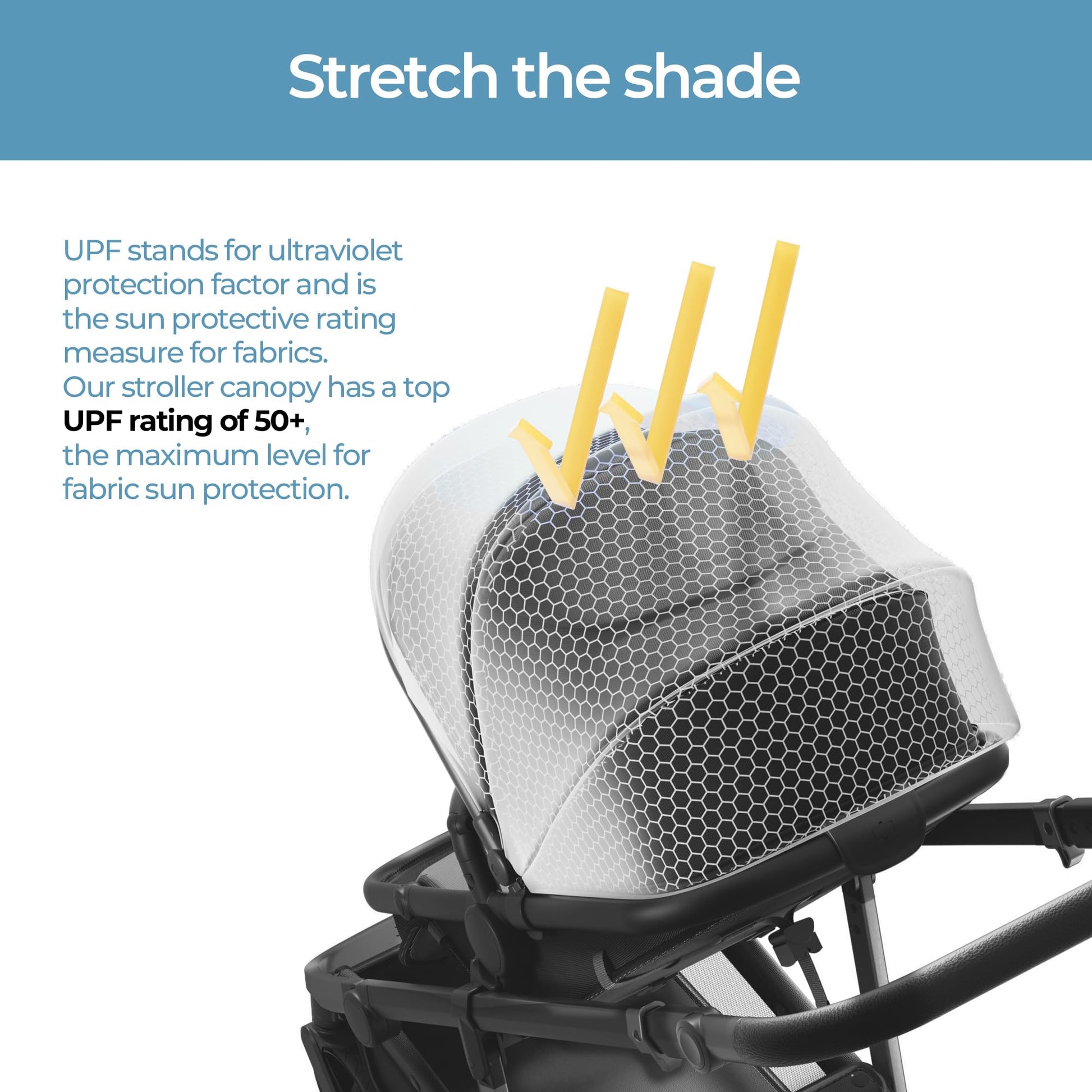 - Shielded & Safe: When you're invited out on a bright sunny day, accept the invitation. This stroller for newborn children has a zip-out UPF 50+ canopy that provides maximum coverage. With ventilation panels on the side providing optimal airflow and natural light. Foot cover and rain cover included for severe weather