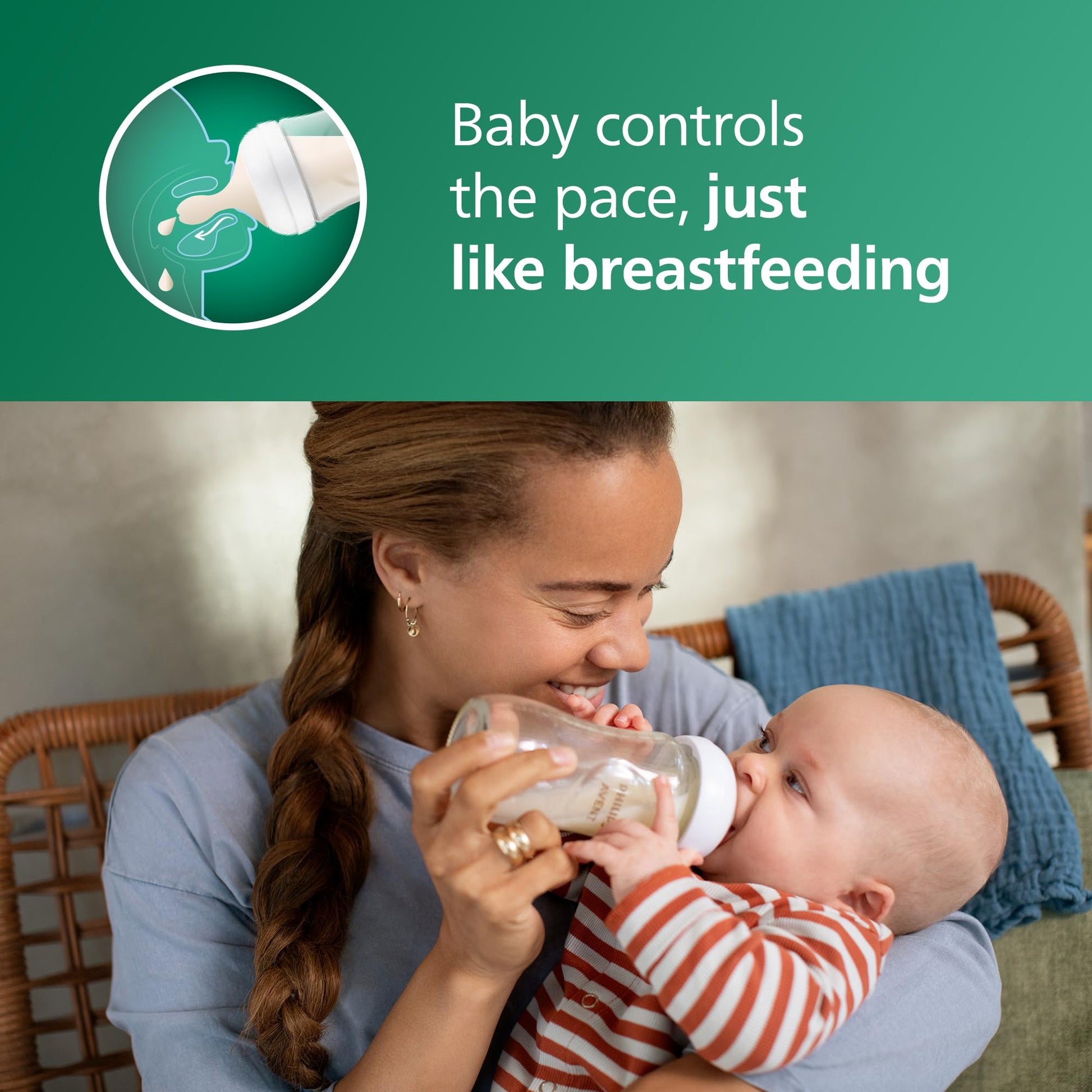 - Philips Avent Glass Natural bottle with the Natural Response nipple lets baby control the pace of the milk, like they do when breastfeeding.