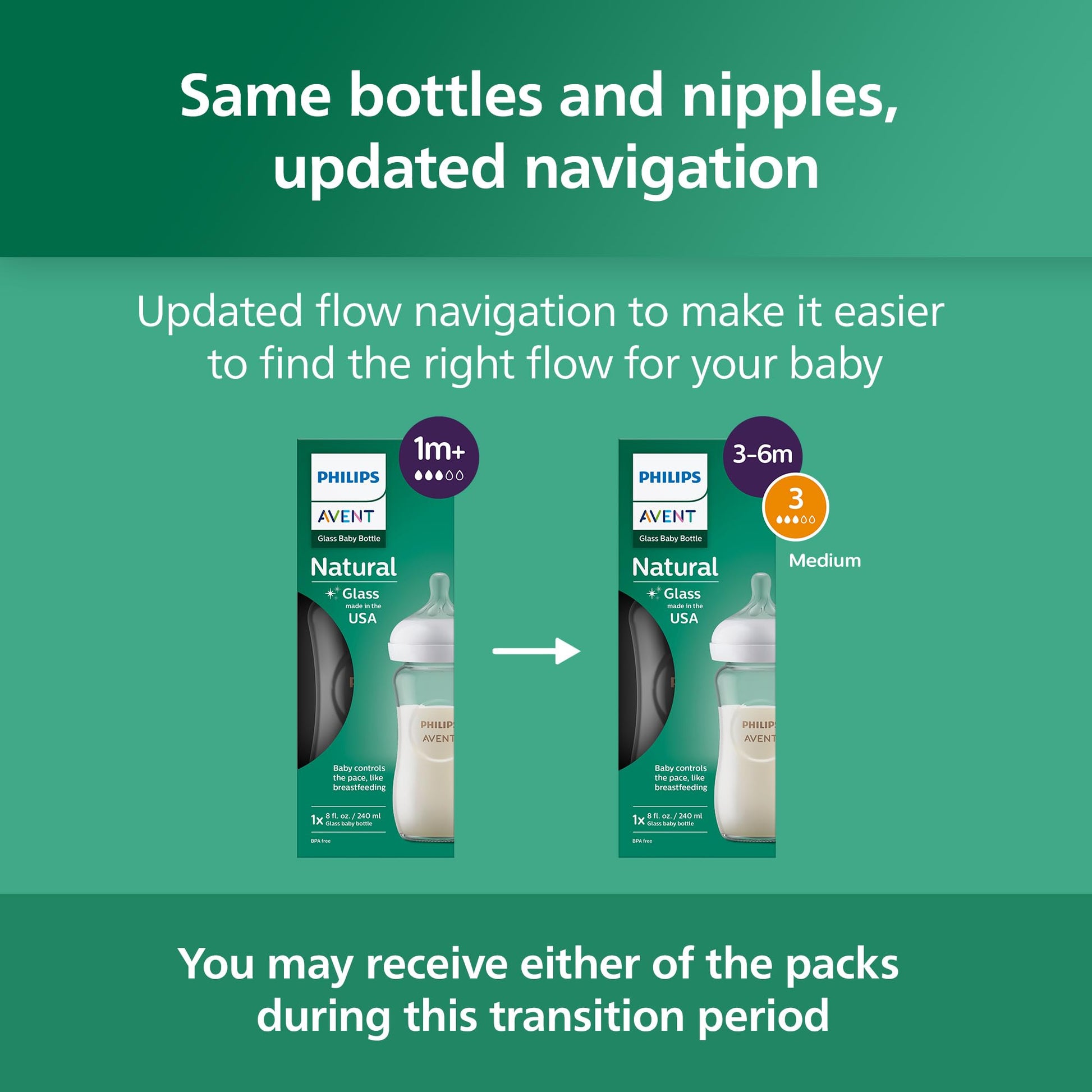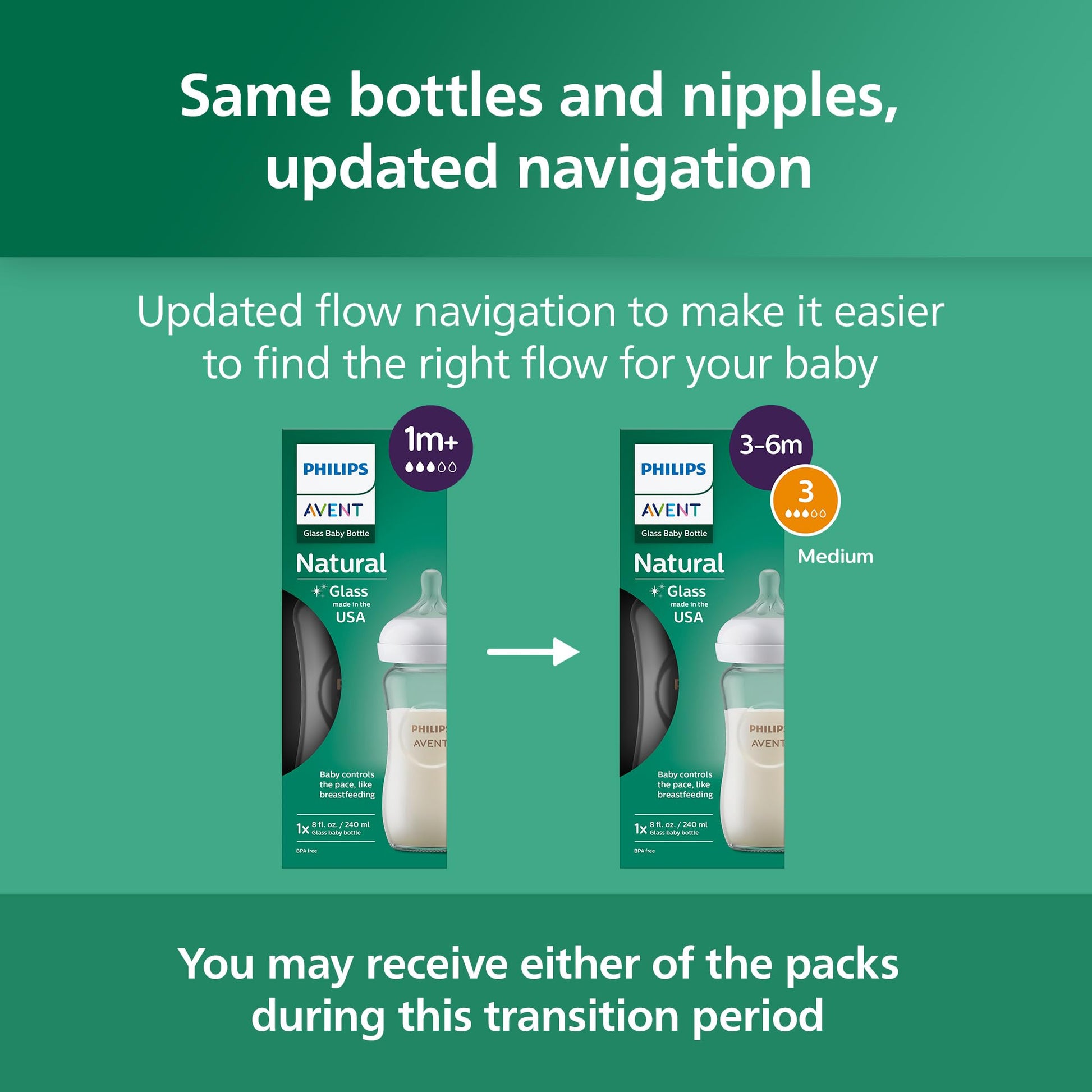 Philips Avent Natural glass bottles for babies support the well-being of your baby so you can take the best care of yourself. The Natural Response nipple with the unique opening and tip lets your baby control the pace of the milk flow, releasing milk only when actively drinking - just like babies do during breastfeeding. When pausing to swallow and breathe, no milk flows. Feeding feels as natural as from the breast! Easily combine breast and bottle feeding with a wide, soft and flexible nipple that mimics the shape and feel of a breast. It helps the baby to latch on and feed comfortably, using its natural rhythm. With the no-drip design, the nipple helps prevent spills and lost milk. An anti-colic valve integrated into the nipple is designed to reduce colic and discomfort by sending air away from your baby's tummy. The ergonomic shape makes it comfortable for parents to hold and easy for small fingers to grasp. Assembly is simple, with only a few parts, while the wide bottleneck makes filling and cleaning easy. Philips Avent Natural glass baby bottles are made of premium quality borosilicate glass, a BPA-free material. They're heat and thermal shock resistant, so they can be safely stored in the fridge, warmed and are easy to wash and sterilize. Use the Philips Avent Natural glass baby bottles with Philips Avent Natural Response bottle nipples. It is totally natural for your baby to take 2-3 tries to get milk flowing from a new bottle. We have 5 different nipple flow rates for the Natural bottle. When looking for the right one, age is a guide, but your baby's approach to drinking and the feeding cues will help determine when to move to a higher or lower nipple flow rate. ¹ IQVIA Health ProVoice Survey 2025, USA