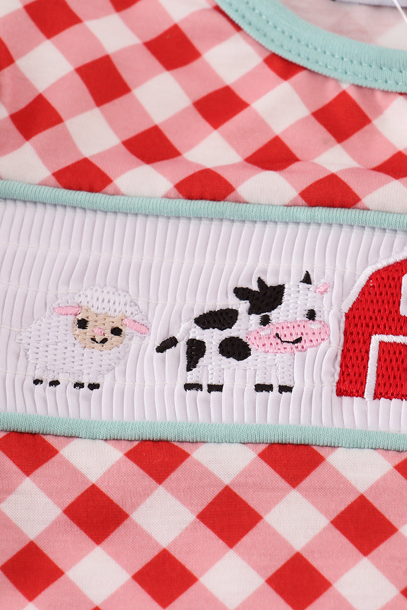 Red farm smocked ruffle romper