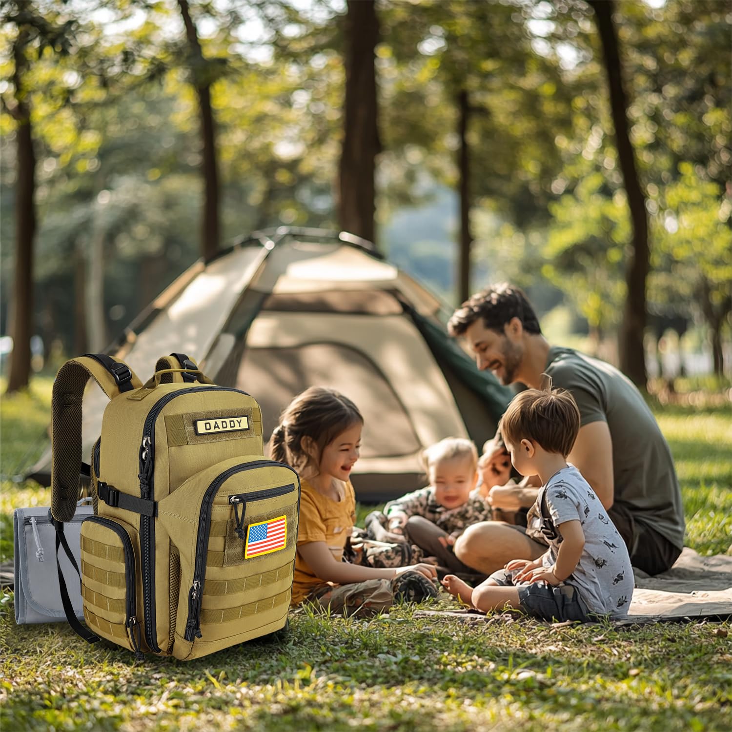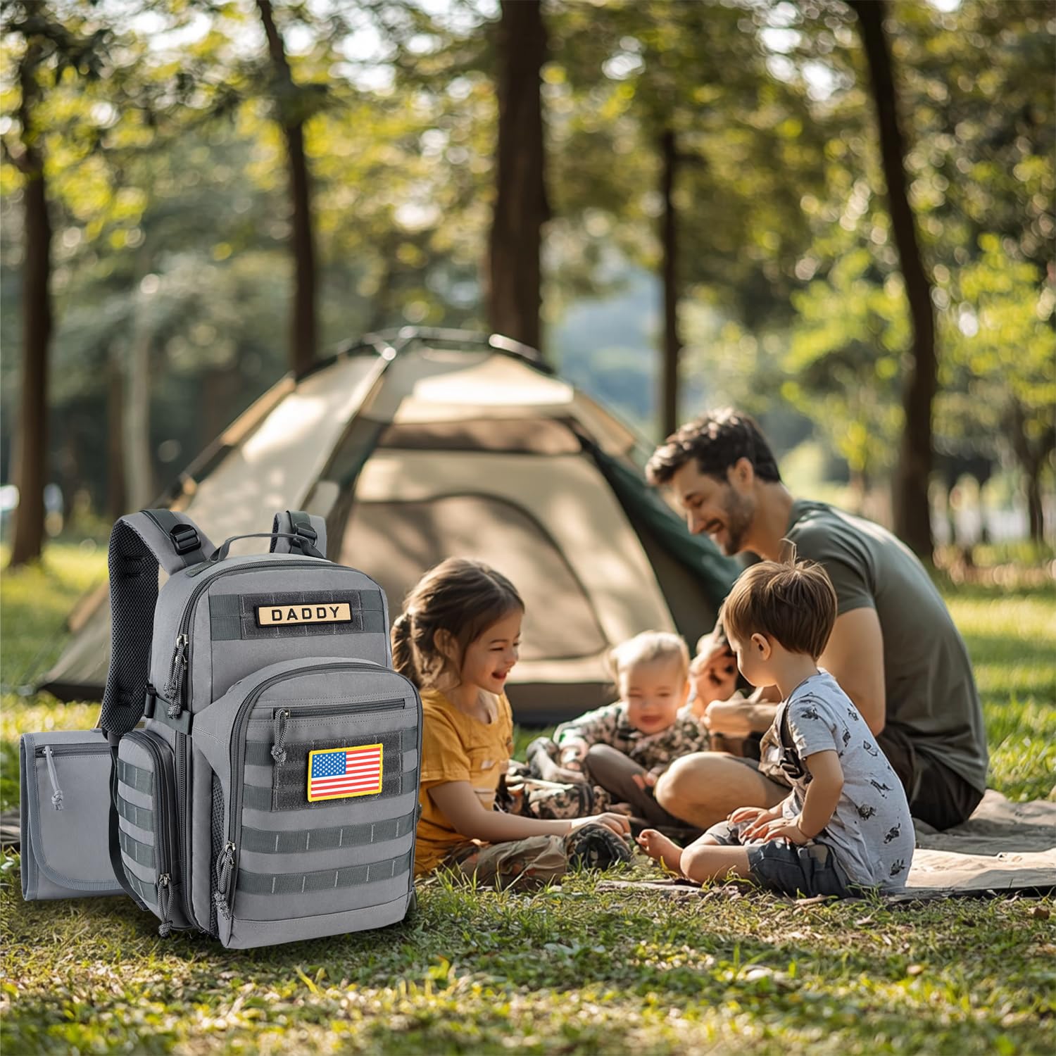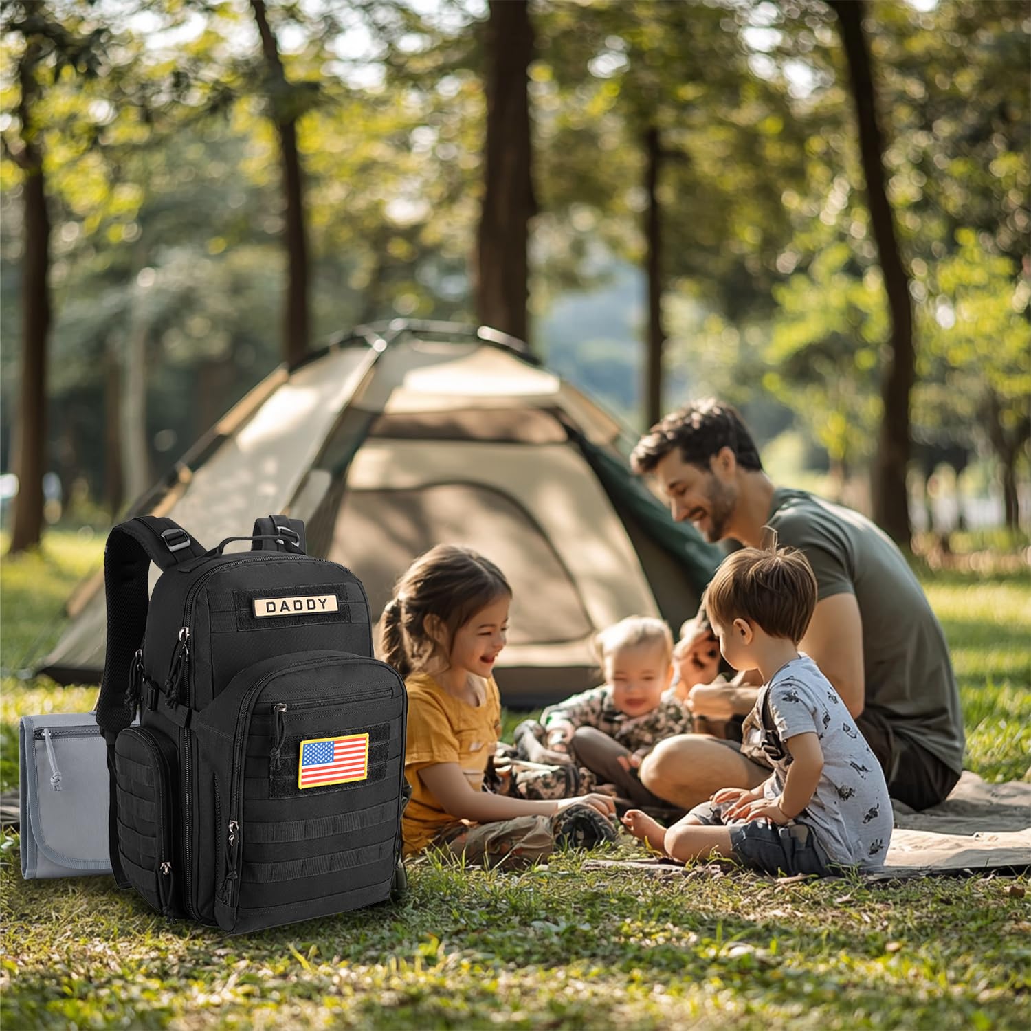 - Dad Centric Tactical Diaper Backpack: This daddy approved diaper backpack features a military style design, crafted with durable 900D polyester for active dads. Its ergonomic shoulder straps and padded back ensure comfort, embodying the perfect balance between spaciousness and practicality for dad's life on the go.