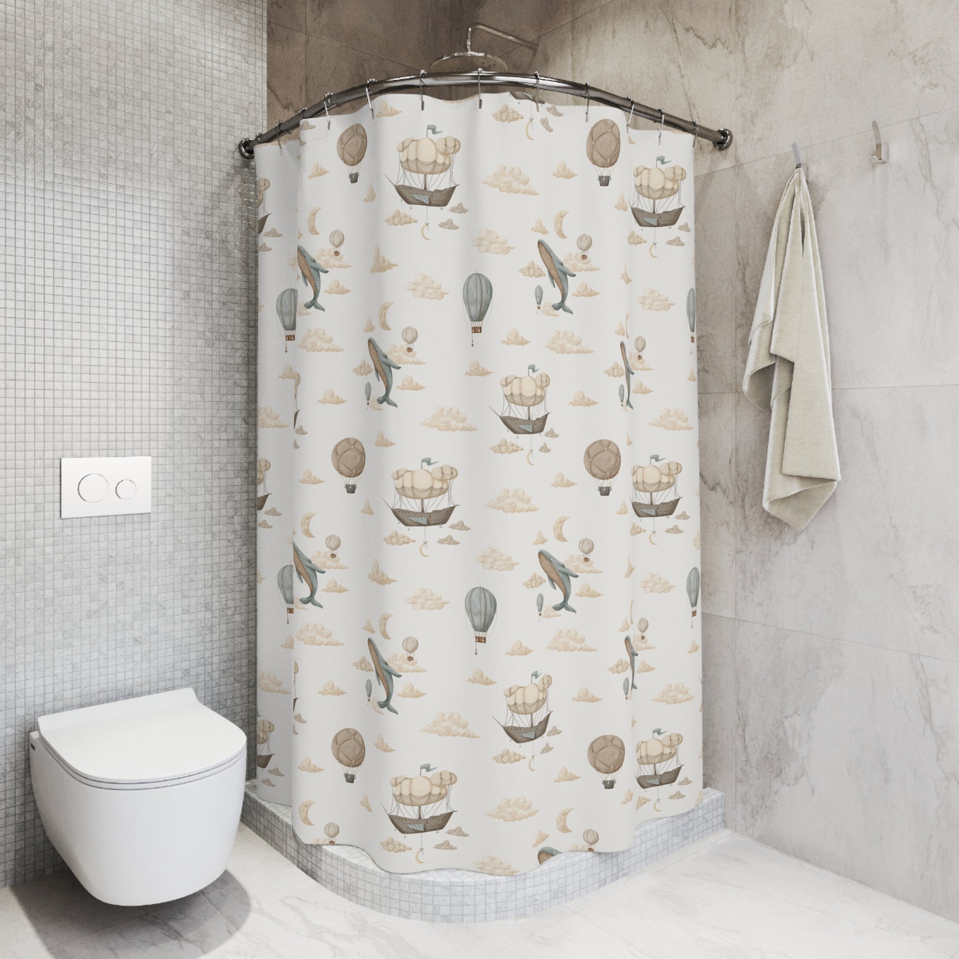 Transform your bathroom with this Shower Curtains featuring a neutral balloon ships design. This durable polyester curtain with buttonholes is perfect for adults looking to add a whimsical touch to their space. Ideal for decorating during birthdays, baby showers, or any celebration.