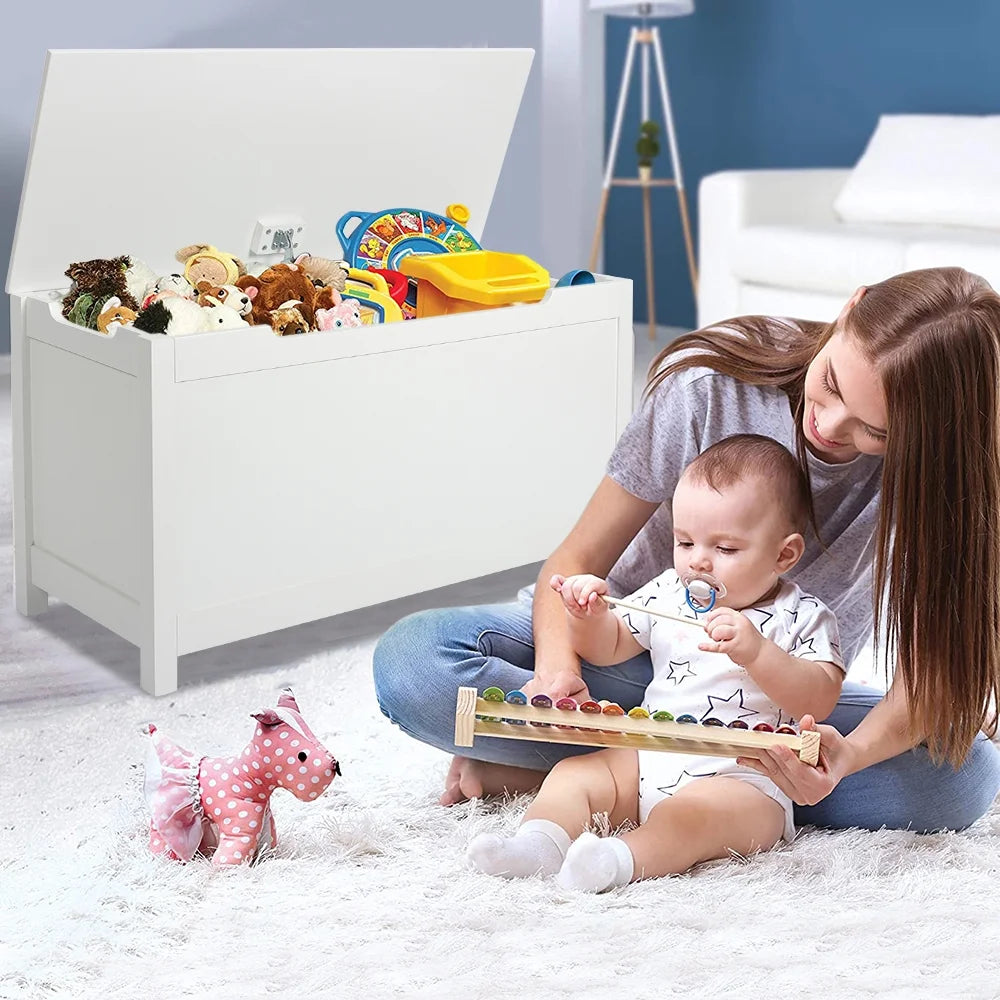 SESSLIFE sturdy Bench Top Toy Box is an attractive and functional storage solution for toys, linens, shoes, hats, mittens, and more. Blends well in any room of the home, such as kid's rooms, foyers, guest rooms, and summer homes. Bench top design is great for kids as a reading bench or a place to perch when dressing or putting on shoes. Quality hardware with two safety support hinges. Two safety hinges hold the lid in the open position to keep little fingers safe from slamming lids. Side handles make it easy to move around when cleaning or rearranging furniture. I believe the SESSLIFE toy storage box will be the best option for your family.