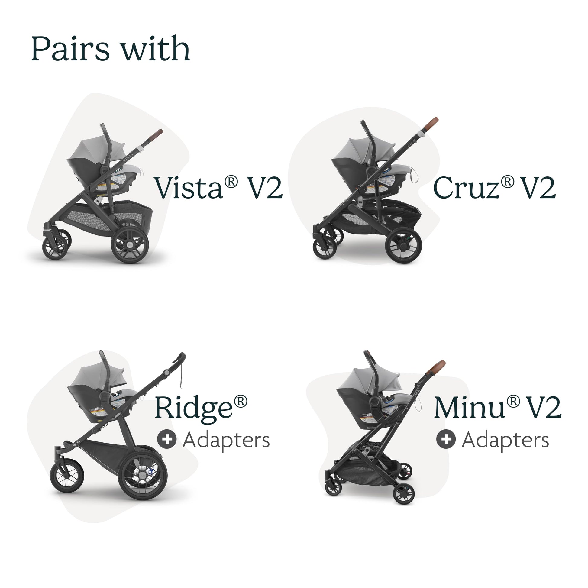 The UPPAbaby Aria infant car seat weighs under 6 lbs, making it highly portable without compromising safety. It features SmartSecure® technology, an Anti-Rebound+ panel, and enhanced side impact protection. The ergonomic handle and adjustable harness simplify use, while breathable fabrics keep baby comfortable. The included base has a narrow footprint with a load leg for added stability, visual indicators for easy installation, and accommodates various seat angles. FAA certified, this seat offers secure, convenient travel for infants.