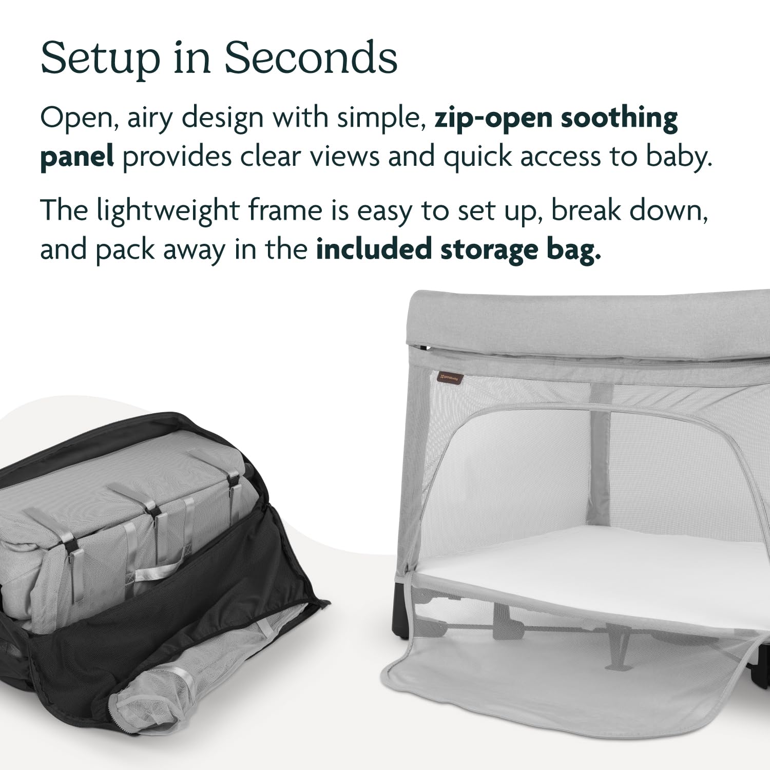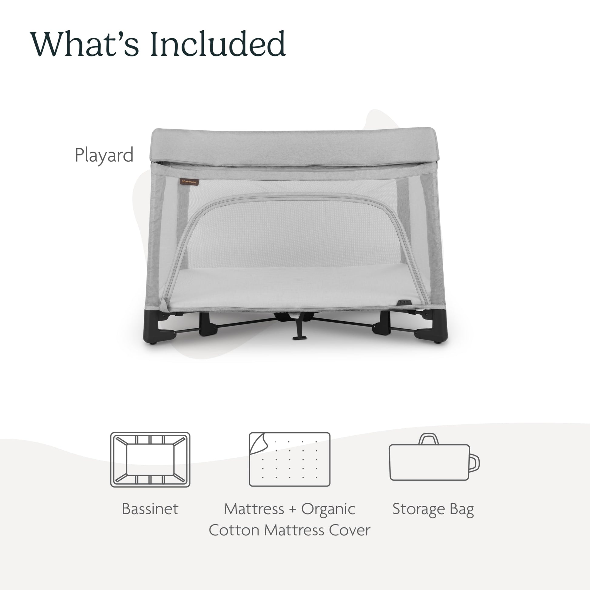 Travel and rest easy with the REMI, UPPAbaby’s first portable playard designed to help baby sleep soundly and safely. Featuring an air mattress (foam-free) and side zip panel giving parents a way to comfortably soothe their child to sleep. Its size, weight and quick set up turns into a go anywhere crib so adventures as a family become easier and more enjoyable. Folds and sets up in seconds with one-hand Triple layer air mesh mattress creates breathable, comfortable and healthier sleep environment for baby Zip open panel for a more comfortable access to soothe baby to sleep Easy to zip on mesh bassinet attachment for added ventilation and provides an elevated sleeping environment perfect for bedside Open, airy design provides clear views Above ground design to keep baby draft proof Durable, woven mélange fabric wraps around top rail for added comfort and softness Convenient storage bag included with pocket to store bassinet attachment Greenguard Gold Certified Playard: Suitable from birth to 35” tall Bassinet: Suitable from birth to 20 lbs Dims: 42" L x 27" W