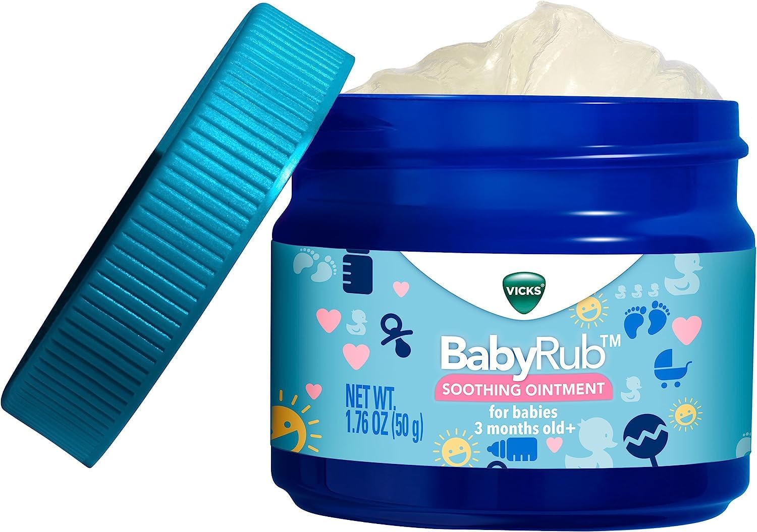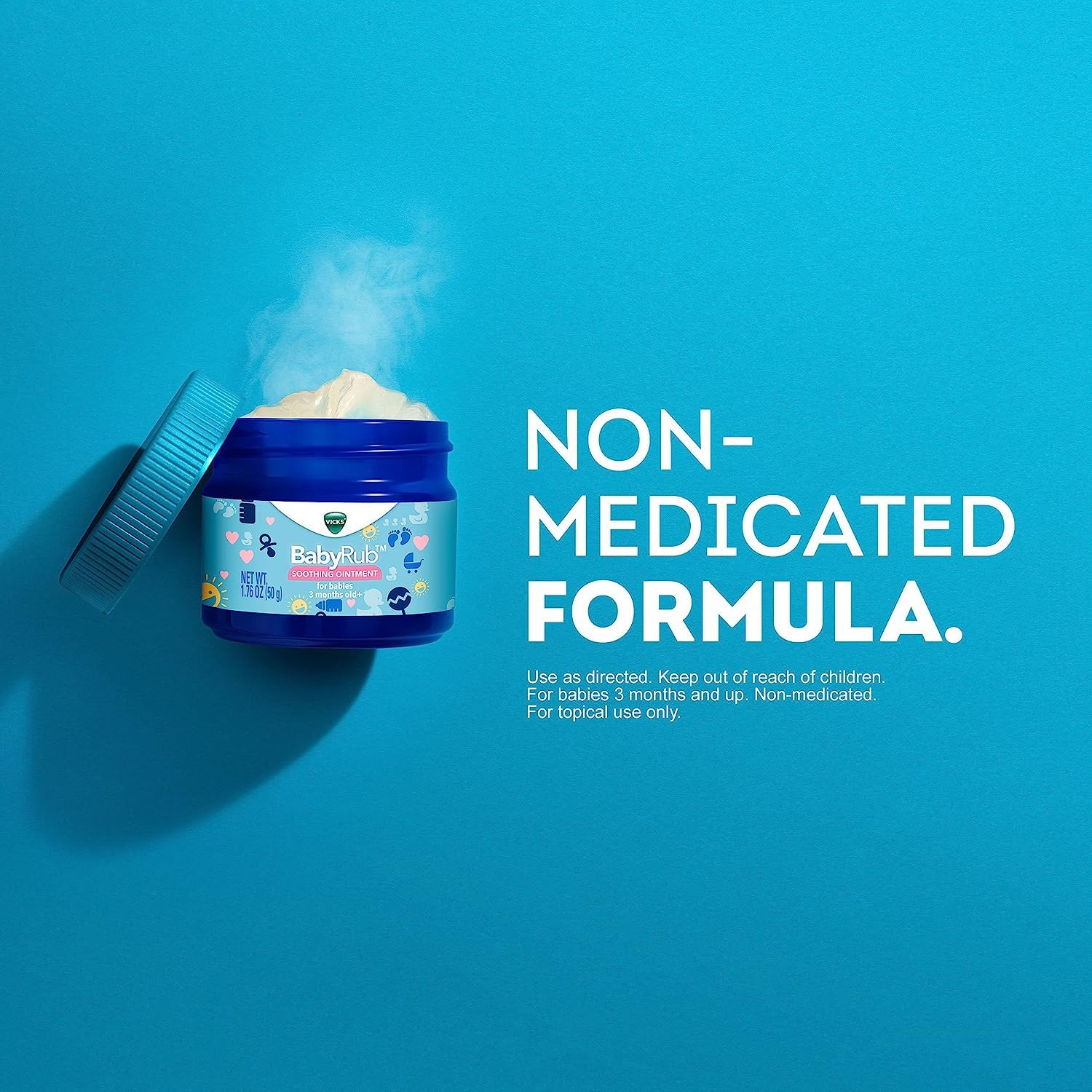 From the makers of the world's best-selling Vicks VapoRub comes a product specially designed for the youngest members of your family: Vicks BabyRub. As a parent, you want to do everthing you can to soothe and comfort your baby. This gentle Vicks BabyRub formula is non-medicated and specially formulated for babies aged 3 months and older. It is formulated with petrolatum and aloe vera to leave your baby's skin feeling soft and comfortable. Vicks BabyRub contains the aromatic fragrances of Eucalyptus, Rosemary, and Lavender. Combined with your loving touch, it's the perfect ointment to calm, soothe, and relax your baby. From the makers of Vicks VapoRub. For use on babies 3 months and older. Gently massage the soothing, non-medicated ointment on your baby's chest, neck, and back to help soothe and comfort. Ointment contains Petrolatum, Fragrance, Aloe Extract, Eucalyptus Oil, Lavender Oil, and Rosemary Oil. BabyRub is non-medicated. Not intended to treat cold or flu symptoms.