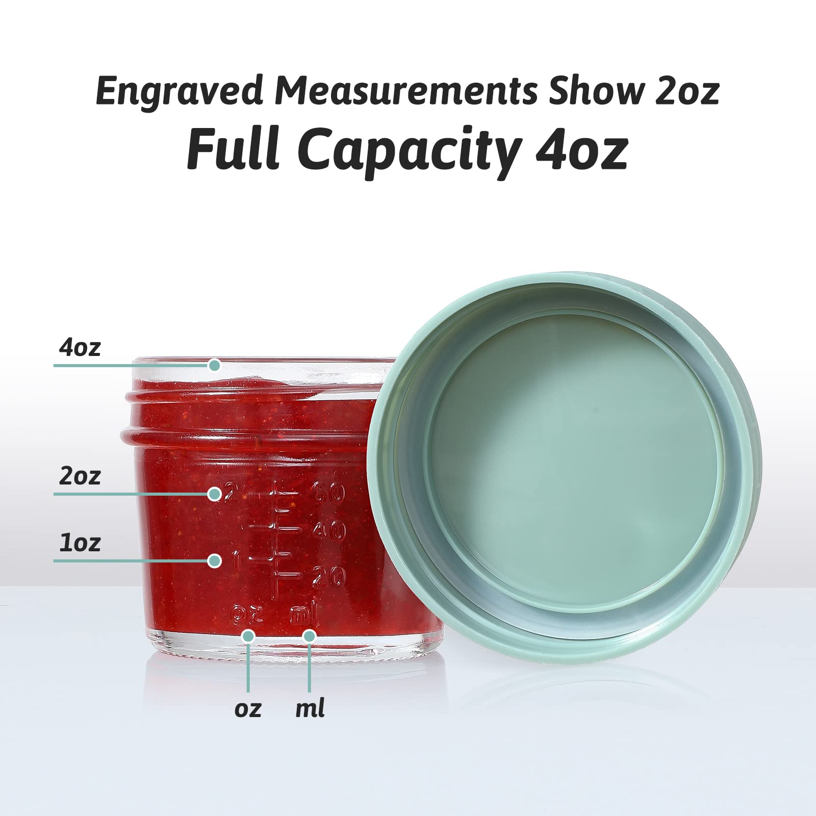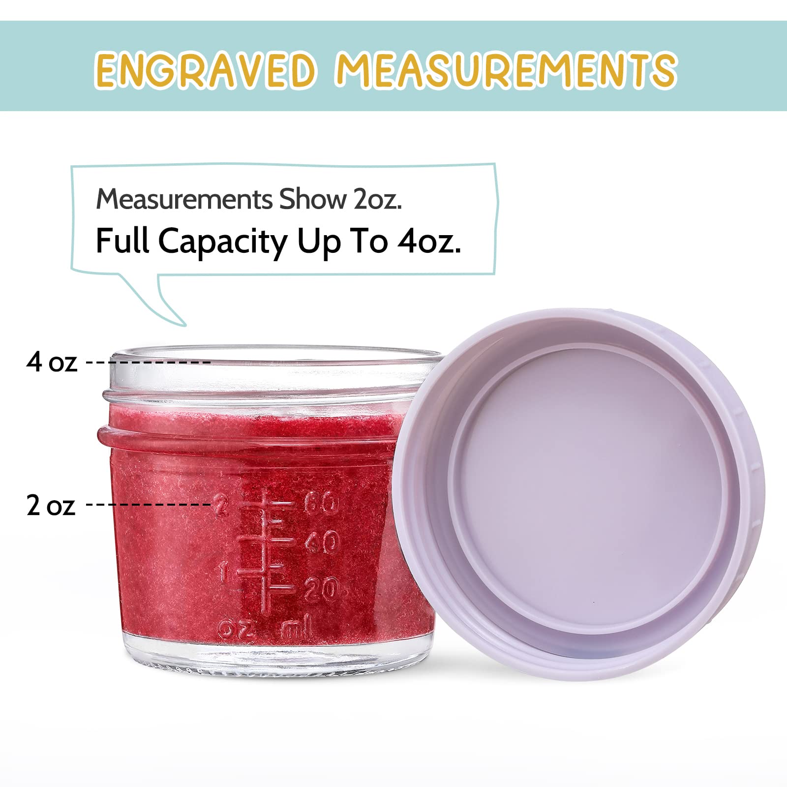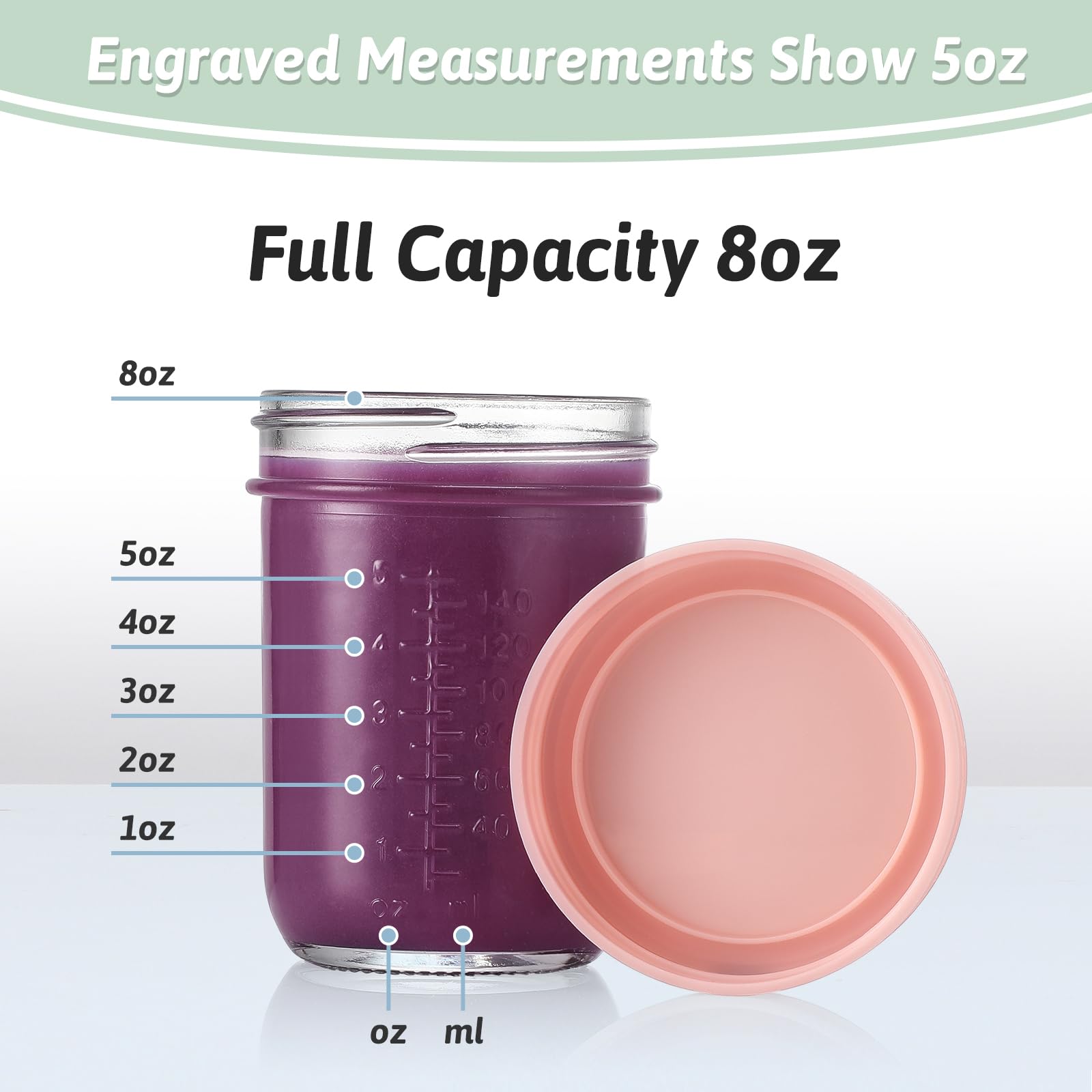 - 8OZ REGULAR CAPACITY WITH SCALE MARKS: 12 packs of the set, each of 8oz. Great and enough for daily baby food preps. And with the engraved measurements, It can be quickly and accurately filled to the desired capacity. The whole capacity up to 8oz if you fill it to the very edge of the jar, but the scale marks on the body show up to 5oz to make sure you can clearly see the capacity from the outside without opening the lid.