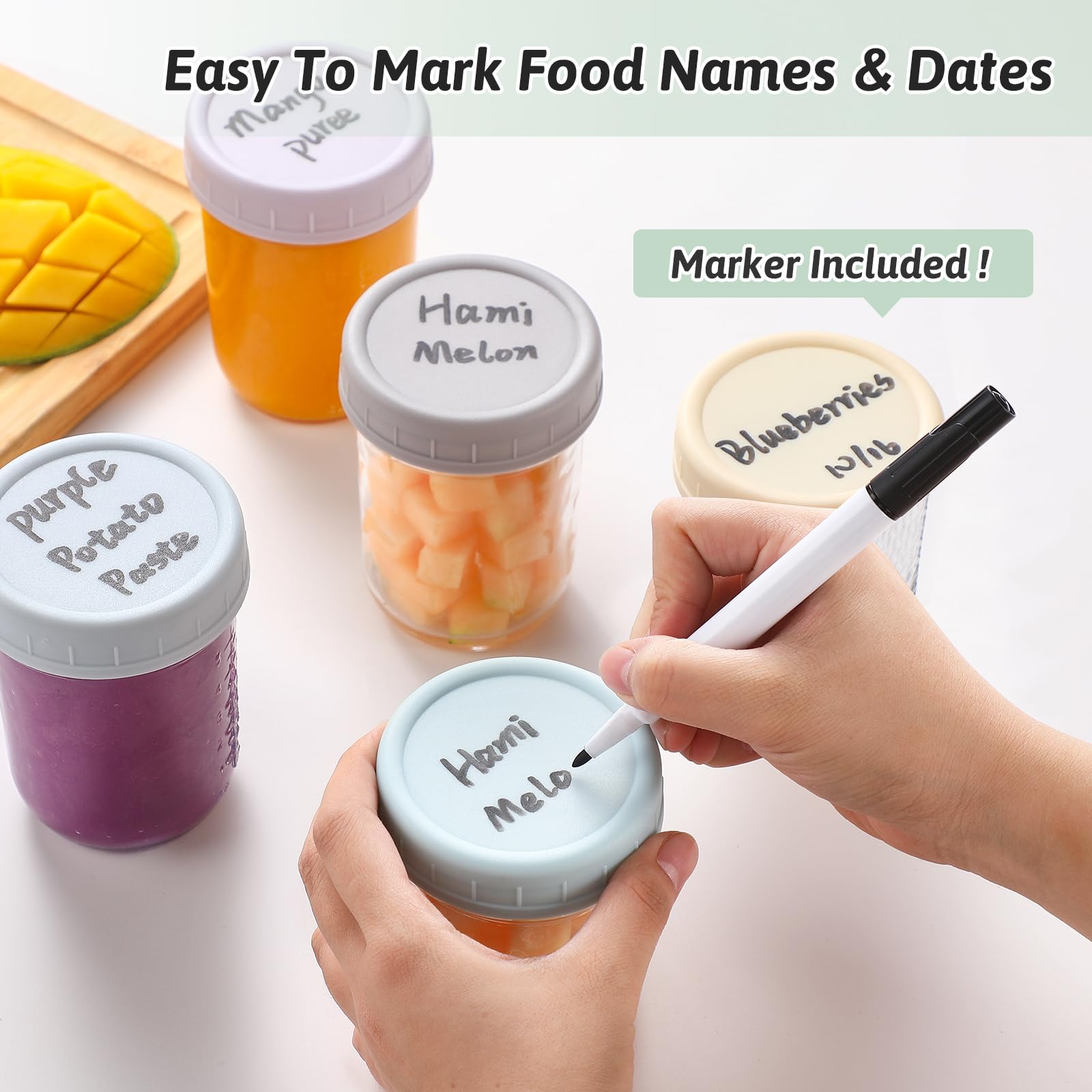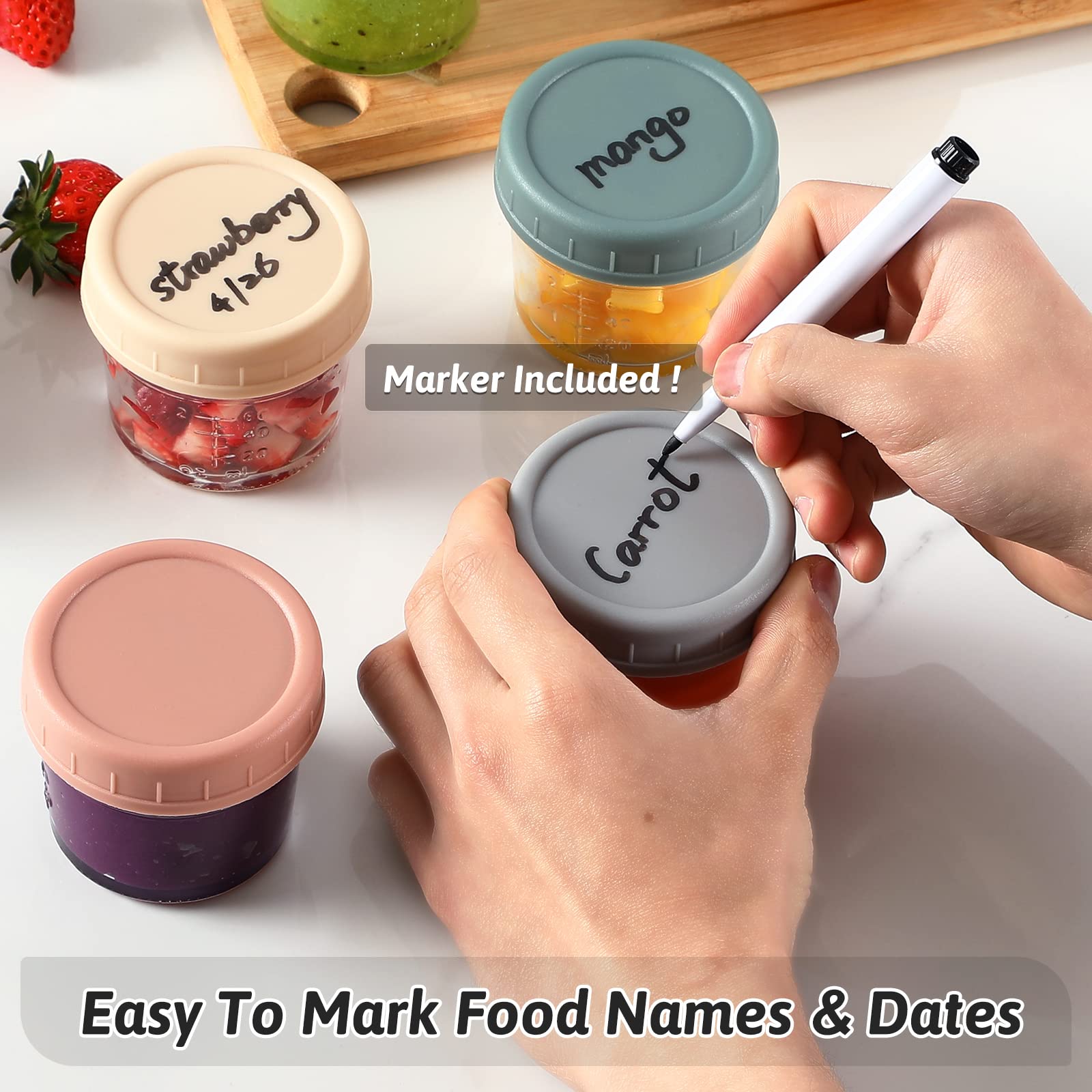 - MARKABLE FOR VERSATILE USES: The marker included in the package is for writing names, dates or other information on lids to remind you what’s inside or when made it. The dry erase marker makes it rewritable and reusable. Very nice to store homemade baby food, solid baby food, fruit & veg puree, mashed avocado, jams, sauce, pesto, etc. Also a wonderful gift choice especially for a baby shower.